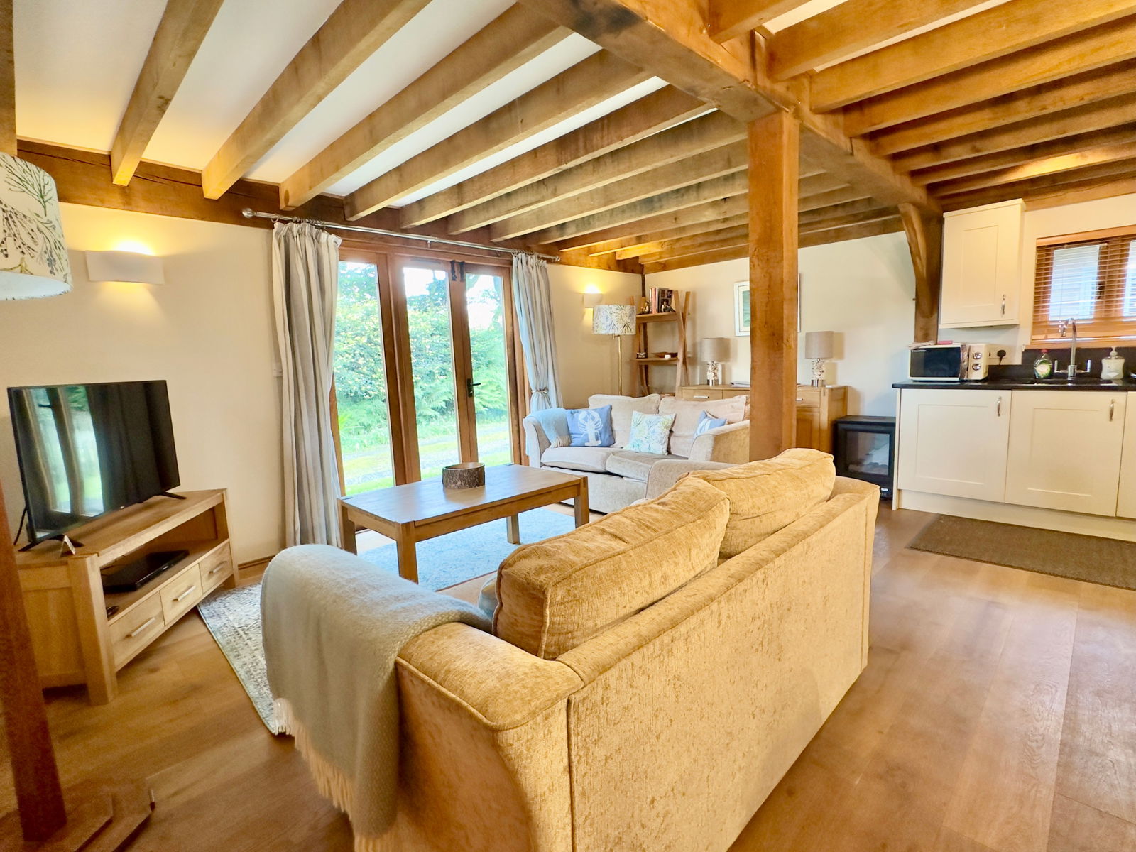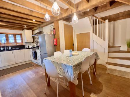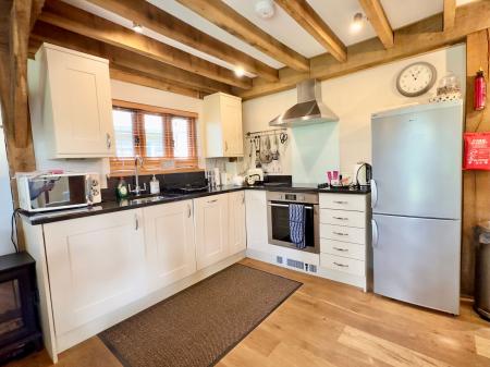 Electric hob, stainless steel extractor fan with oven below. Integrated dishwasher. Integrated washer/dryer. Double glazed timber window. Stainless steel with mixer tap over. Character beams.