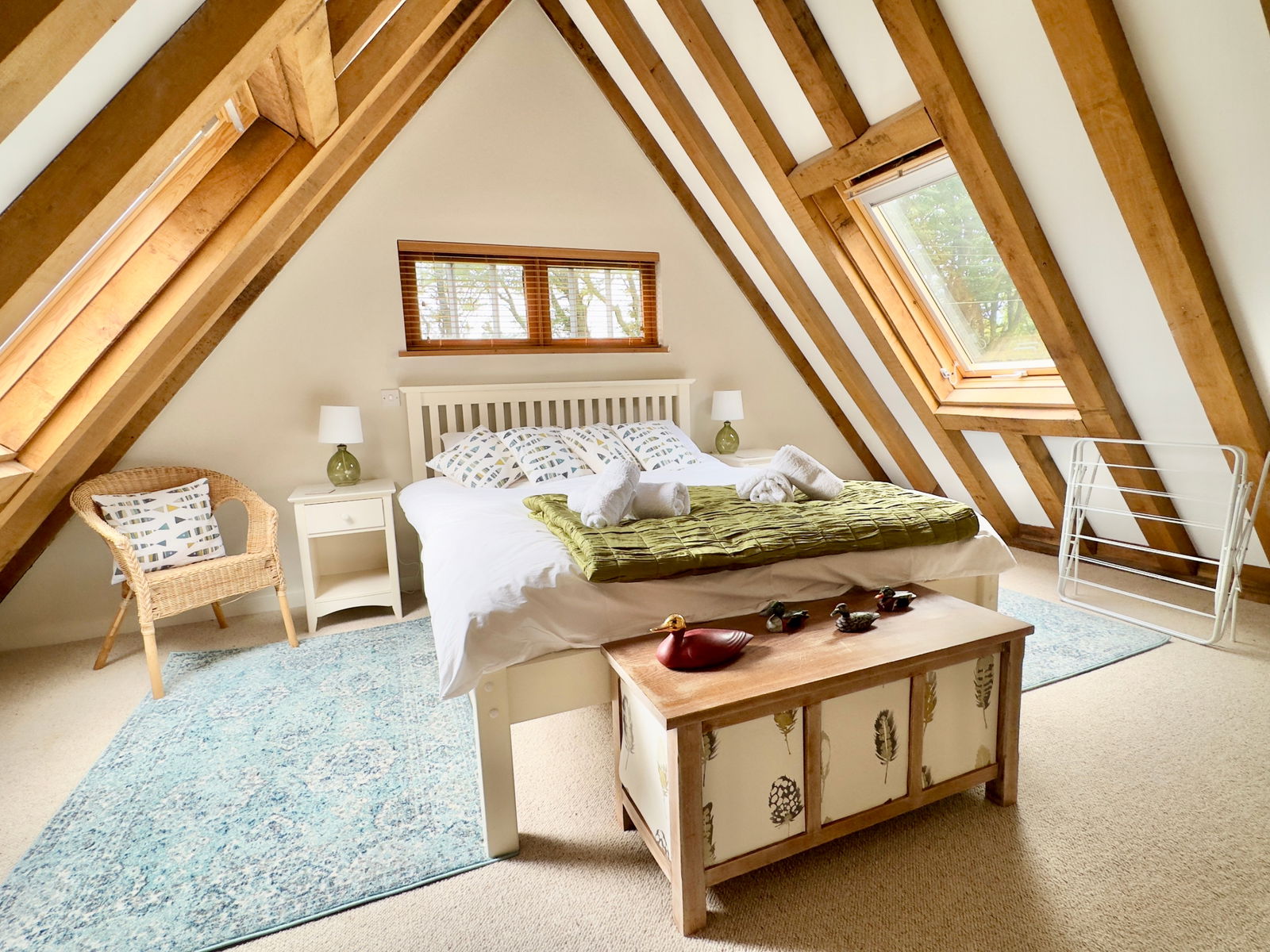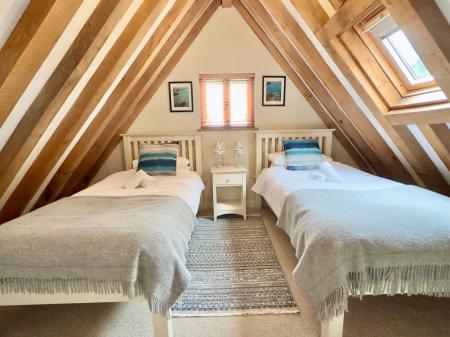 Double bedroom. Built in wardrobe spaces. Electric radiator. T.V. point. Double glazed timber window to rear with 2 double glazed Velux windows either side. Pitched ceiling. Character beams.