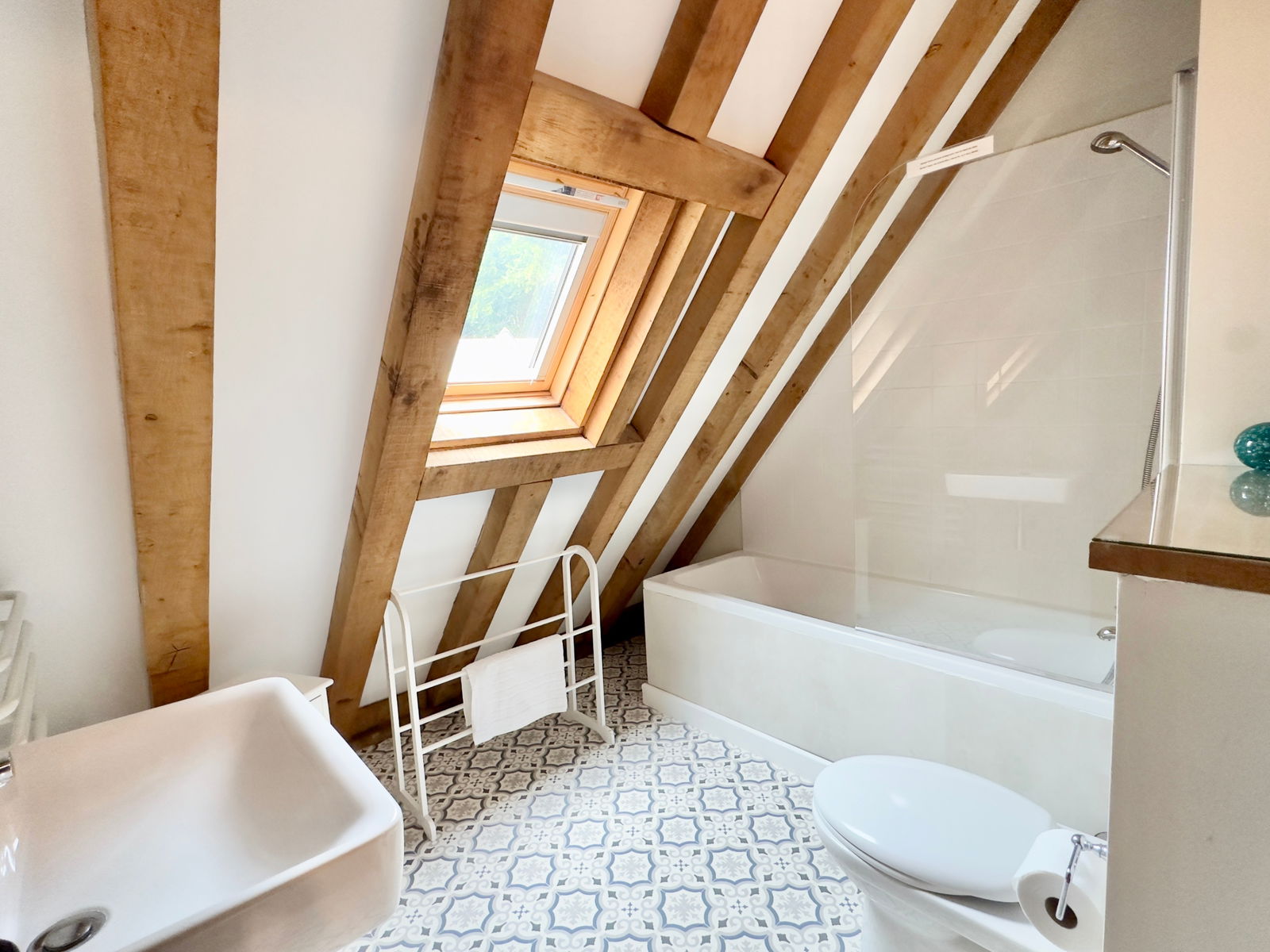 Modern bathroom suite with bath with shower over. Wash hand basin. Low level w.c. Electric towel rail. Double glazed Velux window.