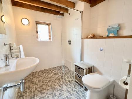 A modern wet room with electric towel rail. Double glazed timber window to side. Shower. Vanity wash hand basin. Low level w.c. Extractor fan.