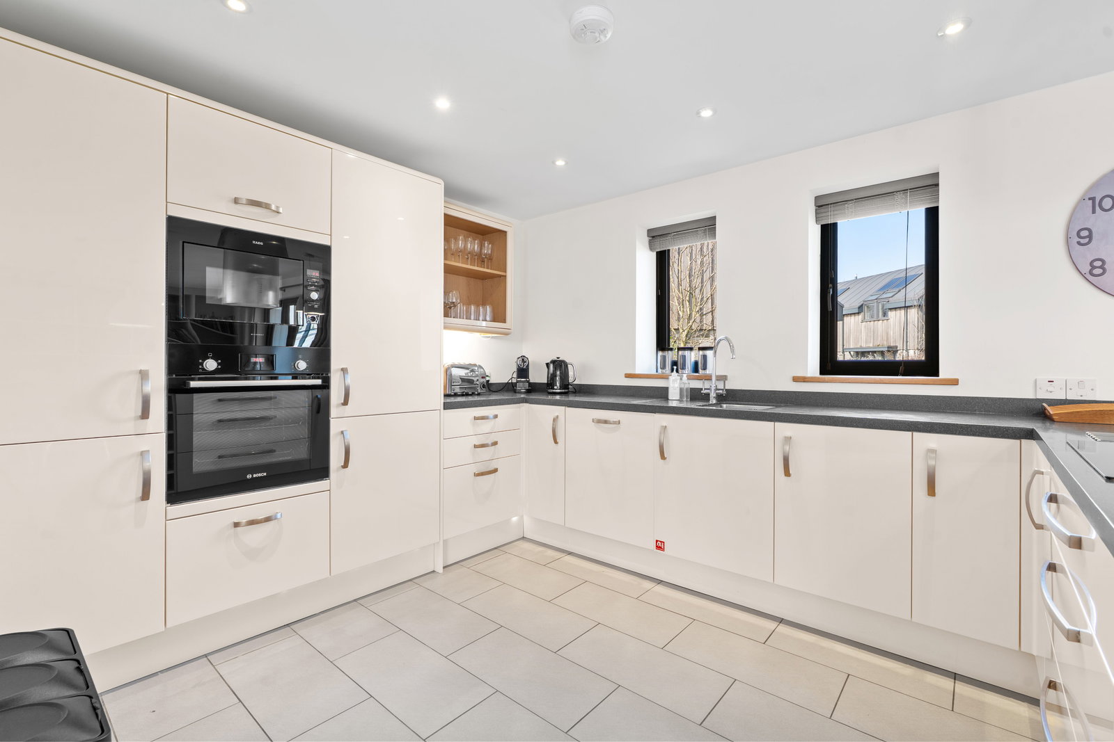 The kitchen area is superbly equipped comprising base cupboards with worktops over and a range of integral appliances including electric oven and a microwave, Inset four ring hob with extractor, dishwasher and fridge/freezer, stainless steel sing unit and mixer tap.