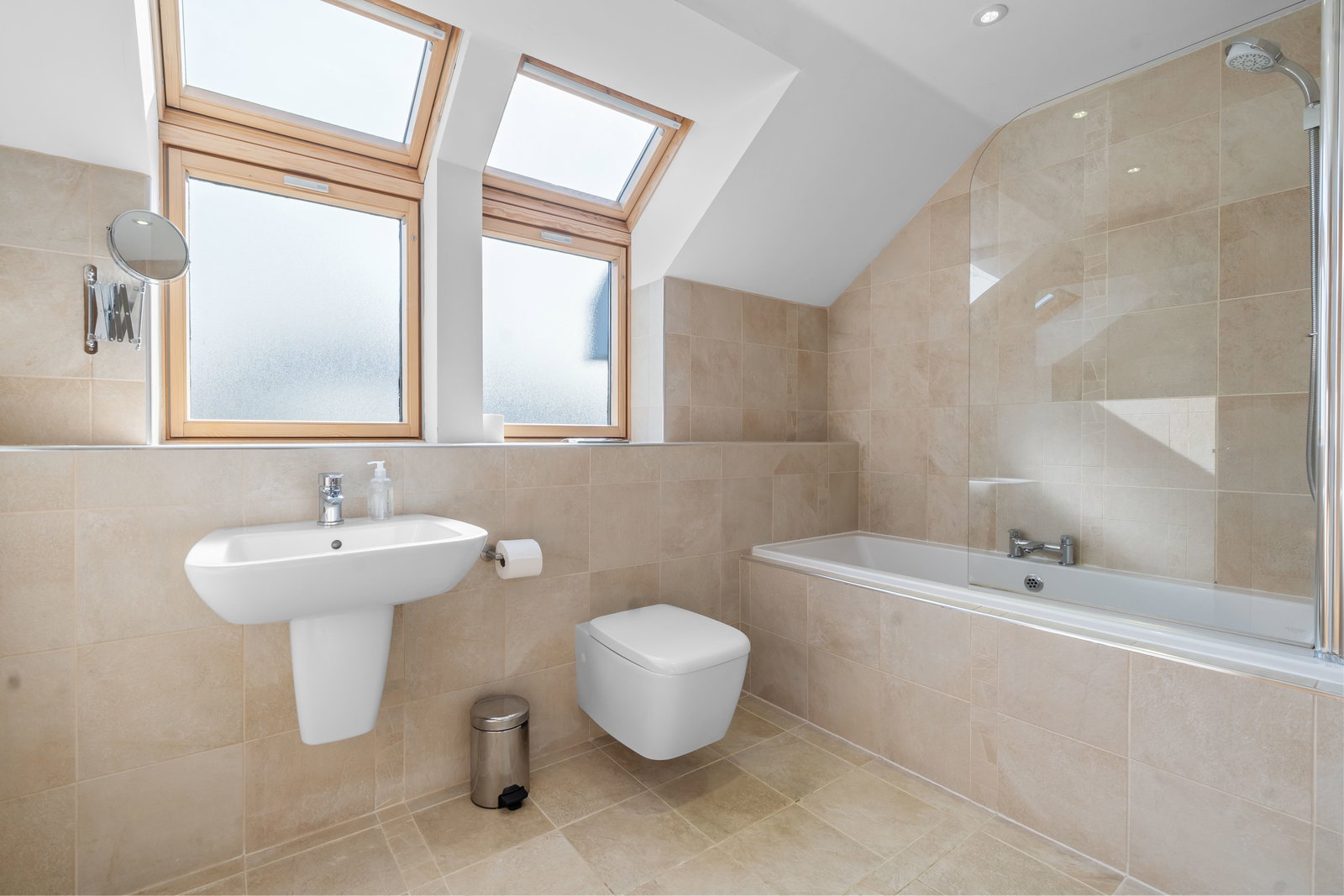 Panel bath and shower with glazed shower screen, low flush WC and wash hand basin, heated towel rail, tiled floor, extractor fan, two opaque patterned double glazed Velux windows to rear.