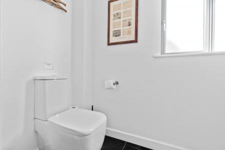 Low flush WC and wash hand basin, extractor fan, slate tiled floor, opaque patterned double glazed window to side.