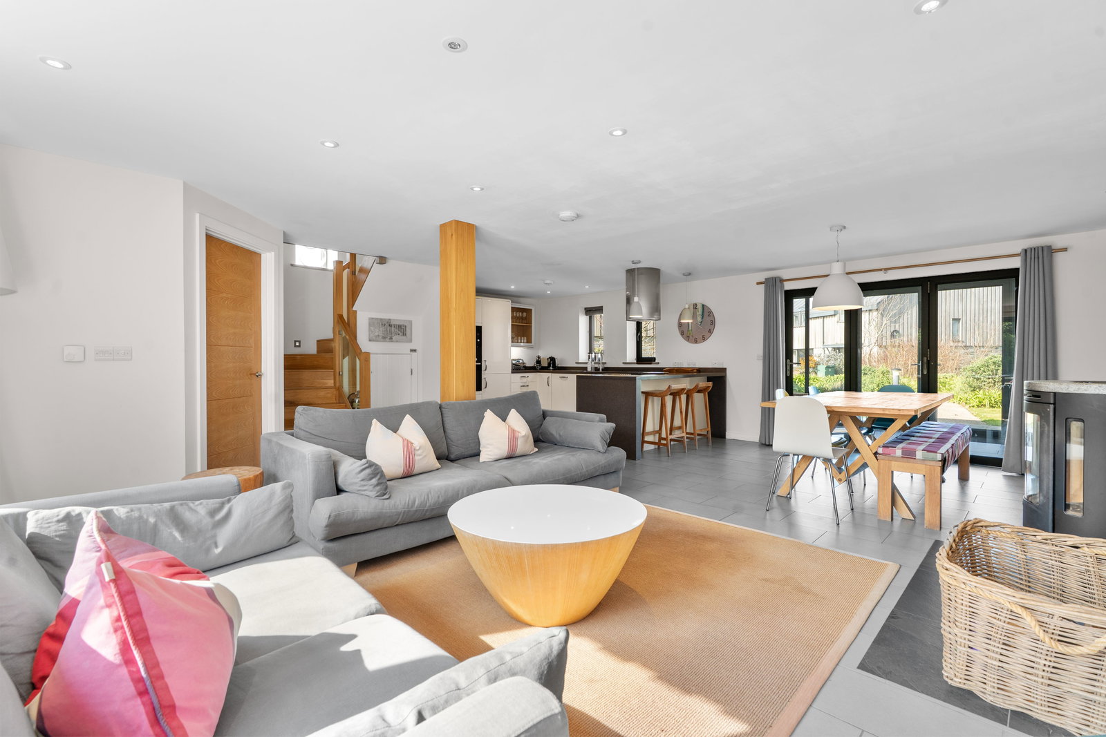 With tiled floor throughout, wood burner set on slate tiled hearth with a range of recessed built in shelving to one side, curved staircase rising to first floor with cupboard under and central heating thermostat for underfloor heating.