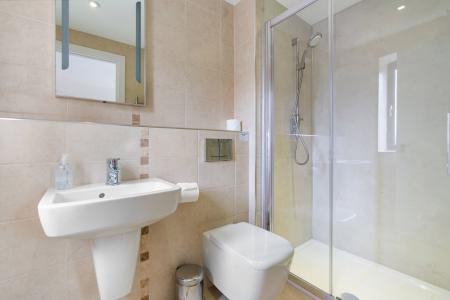 Double shower, low flush WC and wash hand basin, heated towel rail, extractor fan, tiled floor, opaque patterned glazed window to side.
