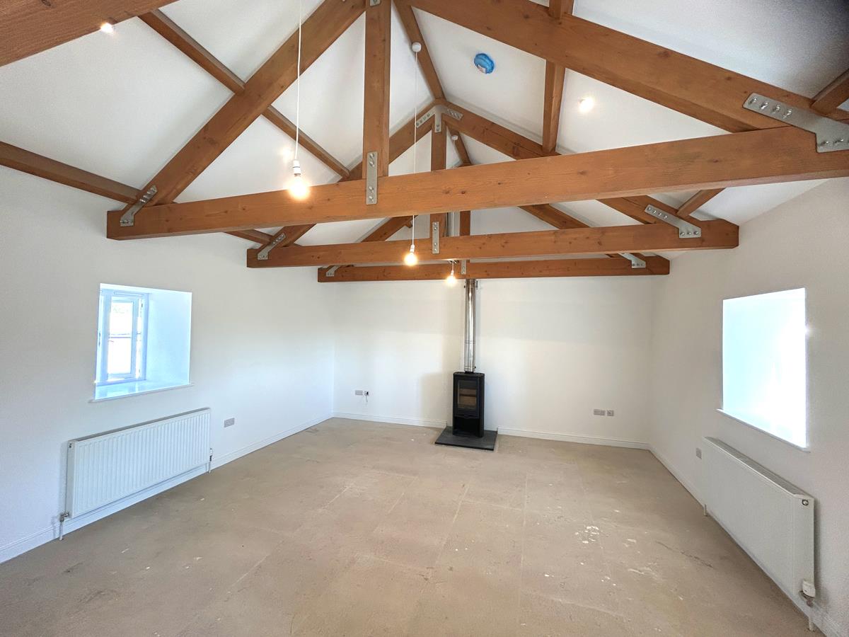 Lounge - 6.88m (narrowing to 4.88m) x 5.21m (22'7" (narrowi - A light and vibrant living space with a vaulted ceiling, authentic exposed beams, and a fabulous modern woodburning stove set atop a slate hearth with a stainless steel chimney style exposed flue, providing a wonderful focal point for the room. Enjoying a dual aspect with windows to both front and rear, a striking picture window with rural outlook towards Boskenwyn and internal windows to the kitchen area. There is pendant lighting, inset spotlighting and an elevated storage cupboard. Door to
