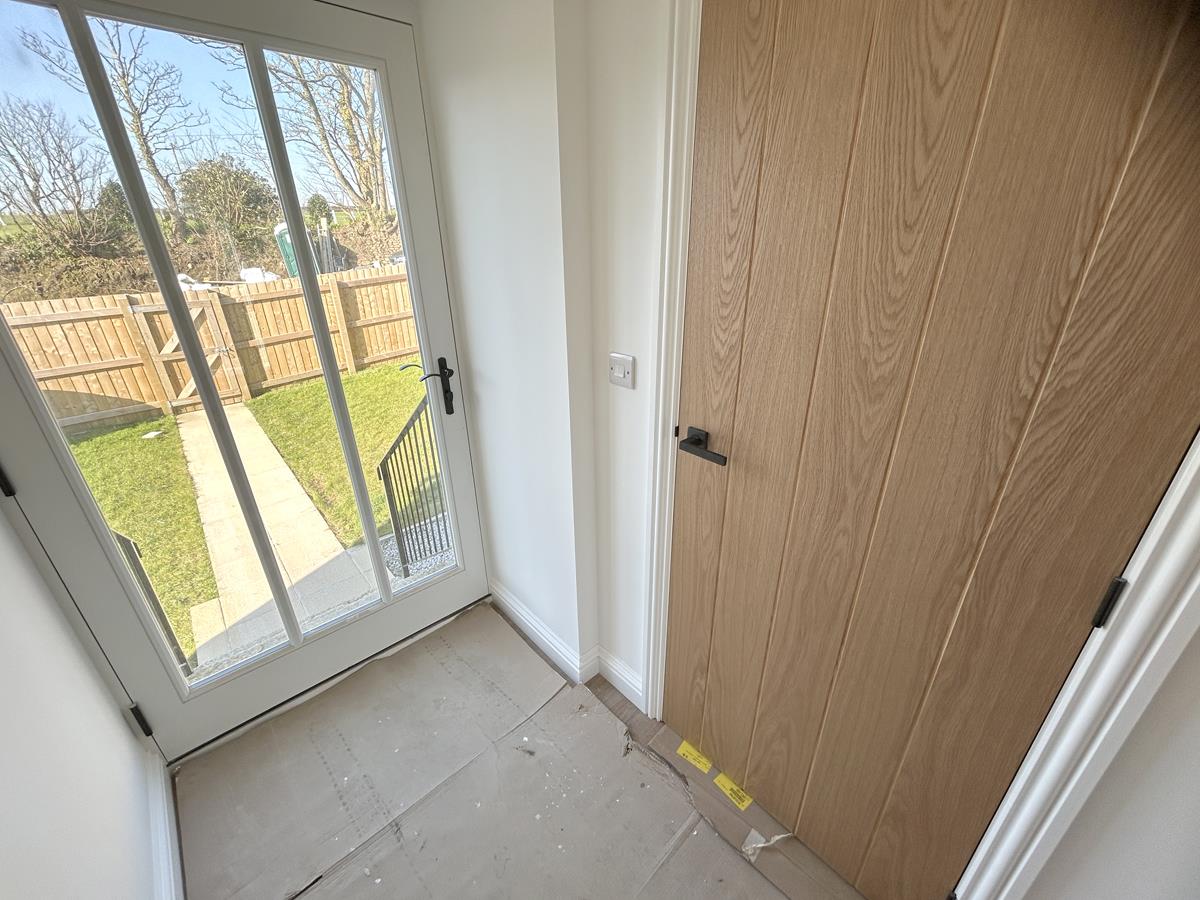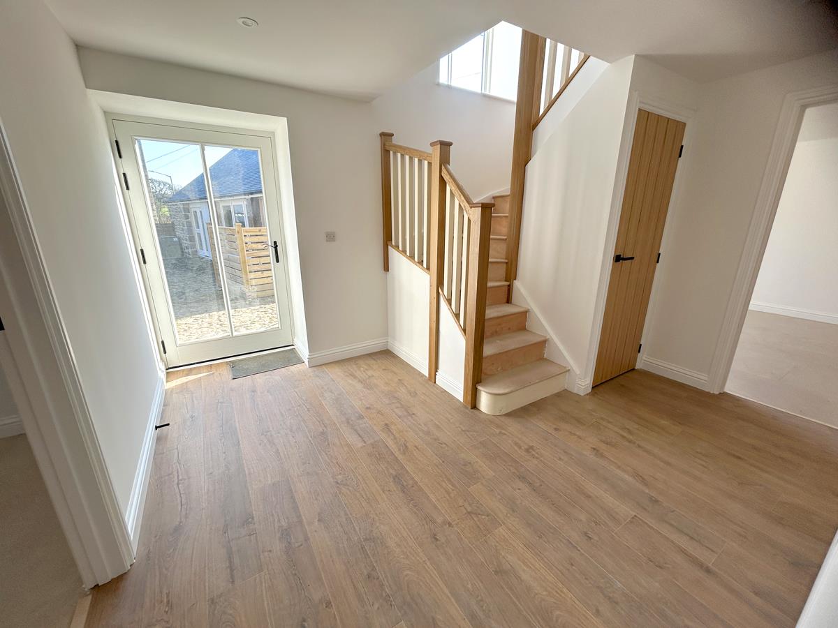 Lower Hallway - With wood flooring, recessed spotlighting, door to useful under stairs storage cupboard, large glazed door to rear courtyard and doors off to the bathroom and all three bedrooms.