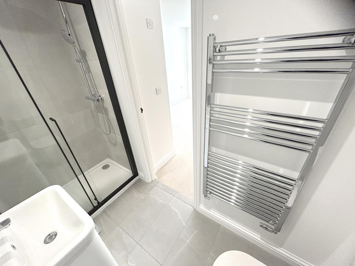 Ensuite - Nicely appointed with white suite comprising a low-level w.c, wash hand basin with mixer tap over and vanity cupboard under and a tiled walk-in shower cubicle with sliding glass door hosting a thermostatic shower with shower attachment and 'rainforest style' drencher head. There is a chrome ladder style towel rail, grey floor tiling, an extractor and recessed spotlighting.