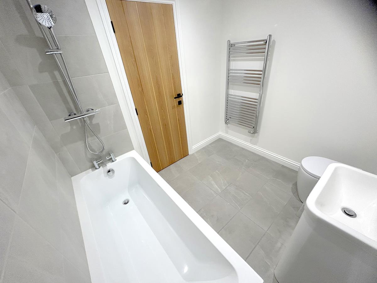 Bathroom - Well appointed with crisp white suite comprising a low-level w.c, wash hand basin with mixer tap over and vanity cupboard under and a panelled bath with tiled surround and a thermostatic shower over with shower attachment and 'rainforest style' drencher head. There is attractive grey tiling to the floor, a chrome ladder style towel rail, an extractor and recessed spotlighting.