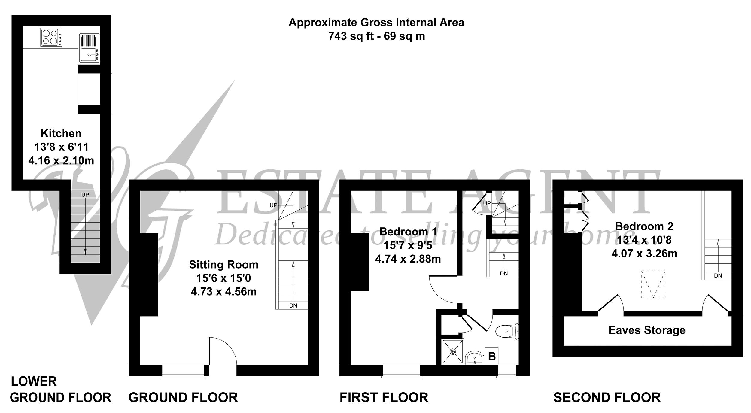 The property is entered directly into the sitting room with open stone fireplace. Open staircases lead down to the dining kitchen and up to the first floor accommodation.
