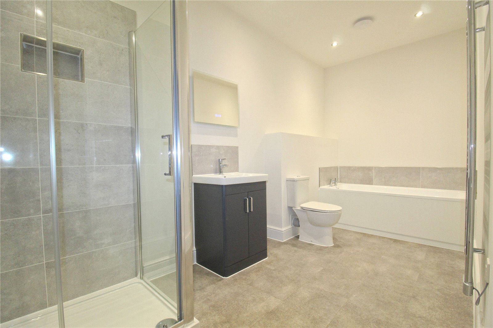 Stepping into the property, a small entrance hall leads into the amazing dual aspect open plan living space. Windows to both sides provide a lovely view of the communal grounds and the tower, a striking centre piece to this amazing development. There is a stylish fitted kitchen with integrated oven, hob, dishwasher and washing machine as well as a freestanding fridge-freezer. Plenty of space is provided for sofas, chairs and dining table whilst a door leads to an inner hall. From here, there are doors to both bedrooms, the bathroom and a particularly large airing cupboard/store room. Both bedrooms are good double rooms with beautiful windows looking towards the tower whilst the bathroom is a remarkable size. There is a four piece suite comprising double shower, separate bath, WC and wash basin.