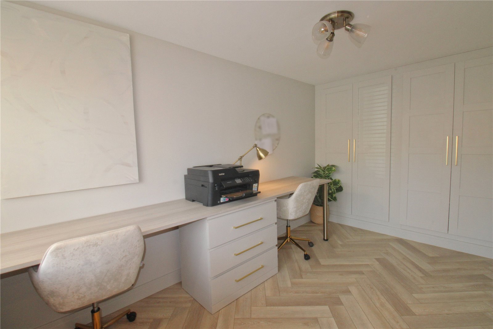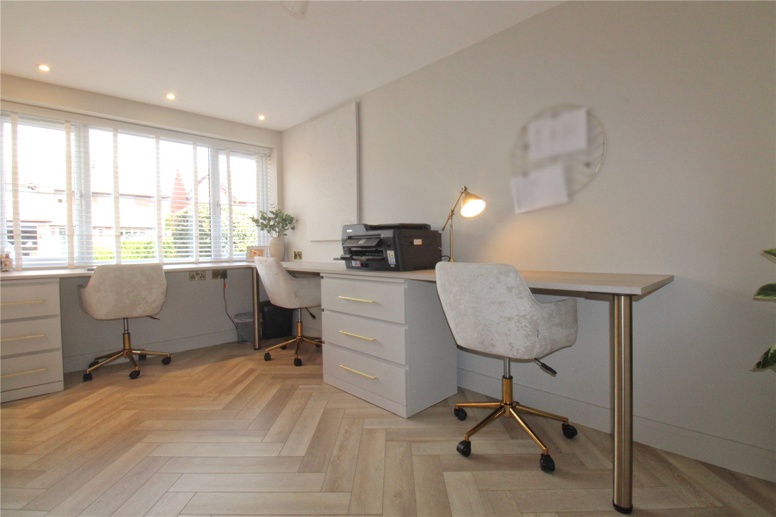 Stepping into the property, the inviting entrance hall has stairs to the first floor as well as beautiful oak doors to the living room, kitchen-diner and home office. The bay fronted living room is a great space to relax and has double doors to the kitchen-diner, providing options for a fantastic social space. Spanning the full width of the house is a superb kitchen/dining/family room which has a selection of stylish fitted units with work surface over, extending to a breakfast bar. There is plenty of space for a table and chairs among other furniture and this leads on to the conservatory. This useful addition further enhances the property by providing more entertaining space and overlooks the garden. A utility room hides noisy appliances out of the way whilst completing the ground floor is a large home office with built in storage which could equally suit as a play room or fifth bedroom.