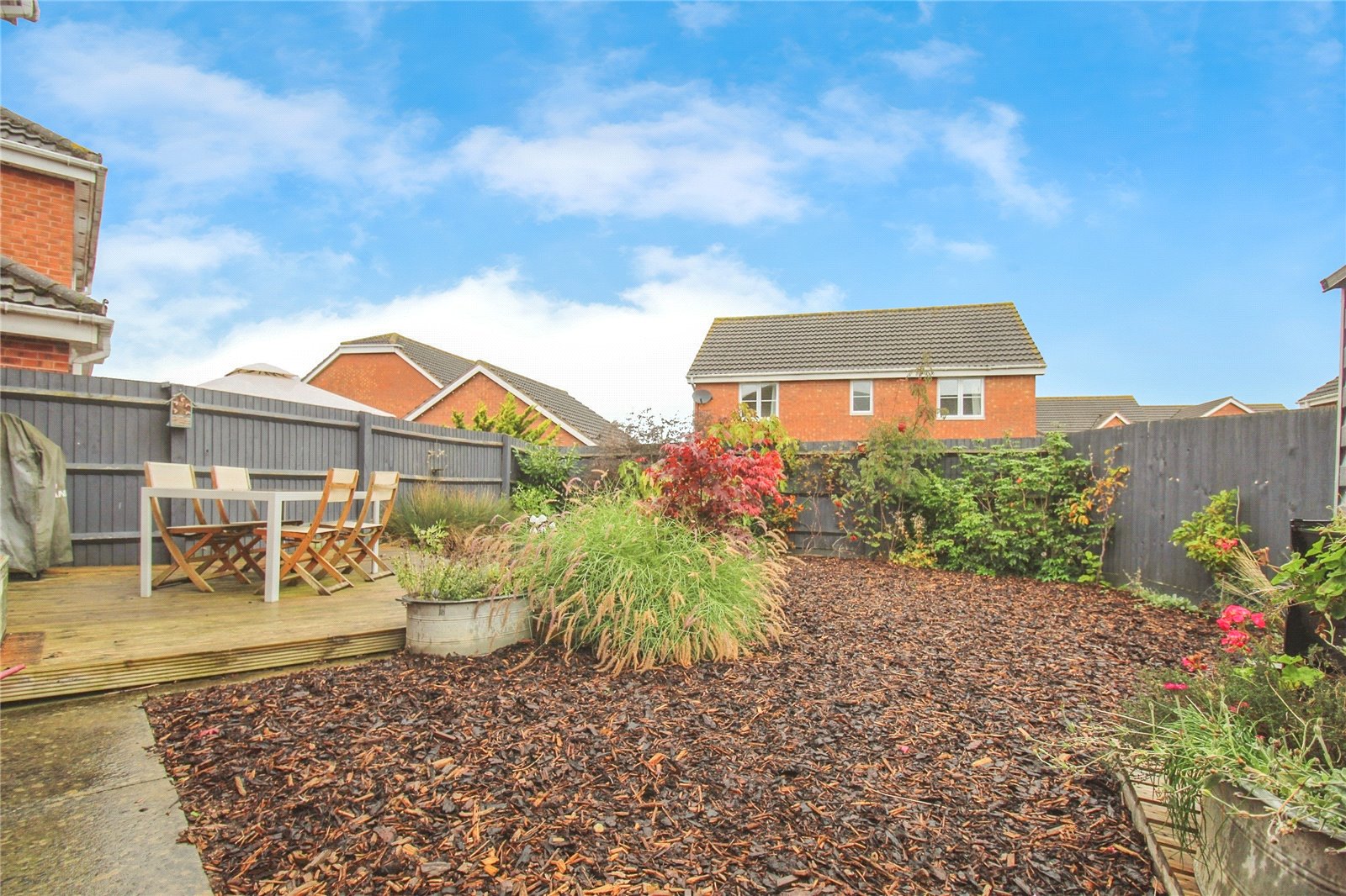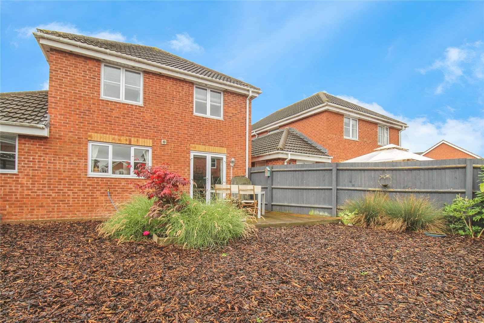 To the front of the property there is a lawn area as well as driveway parking. The low maintenance rear garden is a good size whilst being mostly laid to bark with a useful decking area and a selection of attractive plants and shrubs. The decking area provides a great spot for dining al fresco and there is side access which goes to the front of the property.