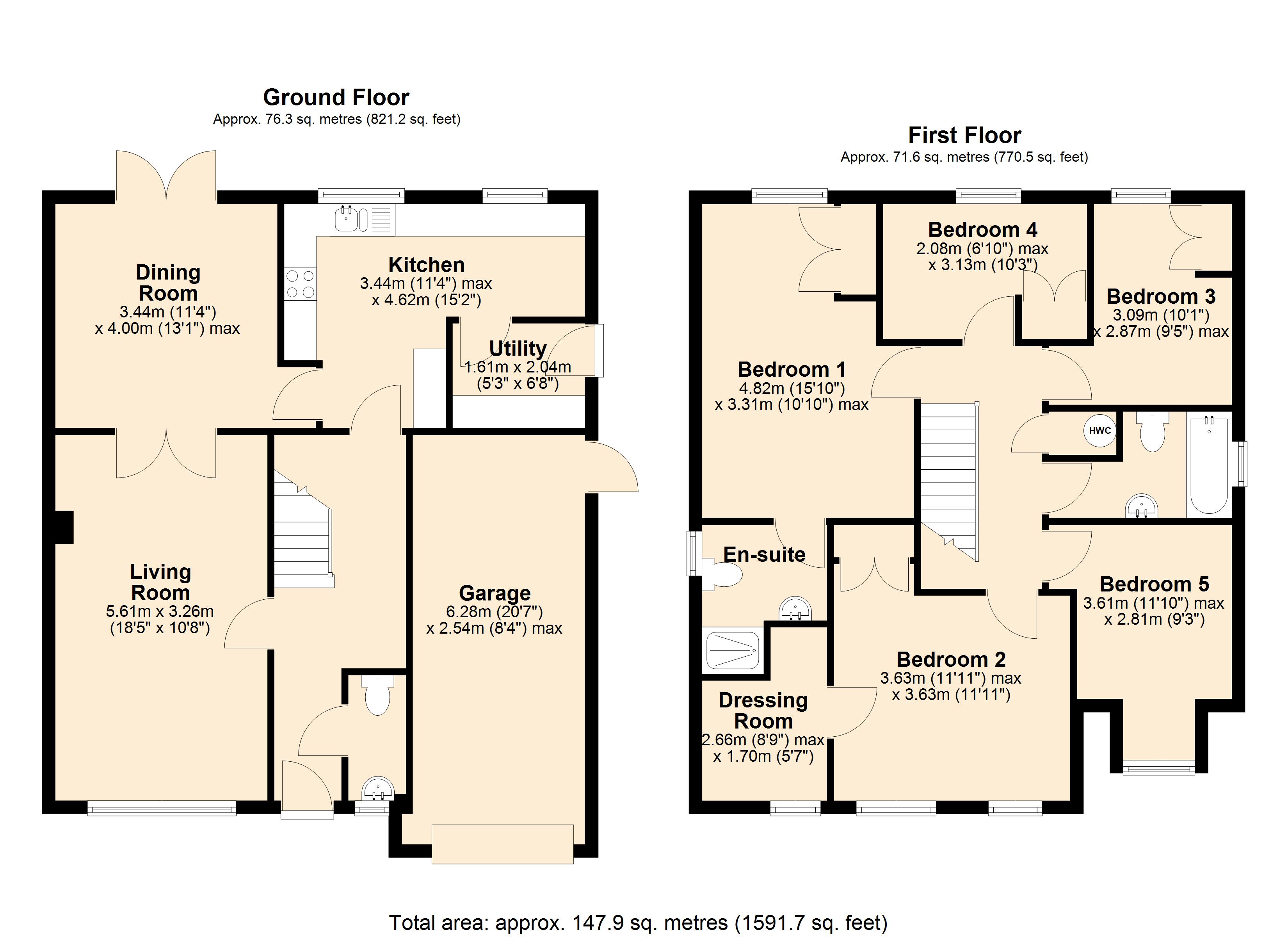 Stepping into the property you find an entrance hall with stairs to the first floor as well as doors to the downstairs cloakroom, kitchen and living room. The living rooms is a nice size and has double doors to the dining room, allowing for a vast and social entertaining space whilst retaining separation. The dining room meanwhile has a door to the kitchen and French doors onto the garden. With a great deal of work top space and fitted units, the kitchen has two windows to the rear, double oven and gas hob. A door leads to the utility room where you find the boiler and a door to the side of the house. Heading upstairs, the landing has doors to all five bedrooms, the bathroom and airing cupboard. Bedrooms one and two are both superb double bedrooms with the main bedroom having an ensuite shower room and bedroom two featuring a useful dressing room/office space. The remaining three bedrooms are generous singles with four of the five bedrooms having built in wardrobes. The bathroom has a bath with shower over and waterproof panelling as well as a WC and wash basin.