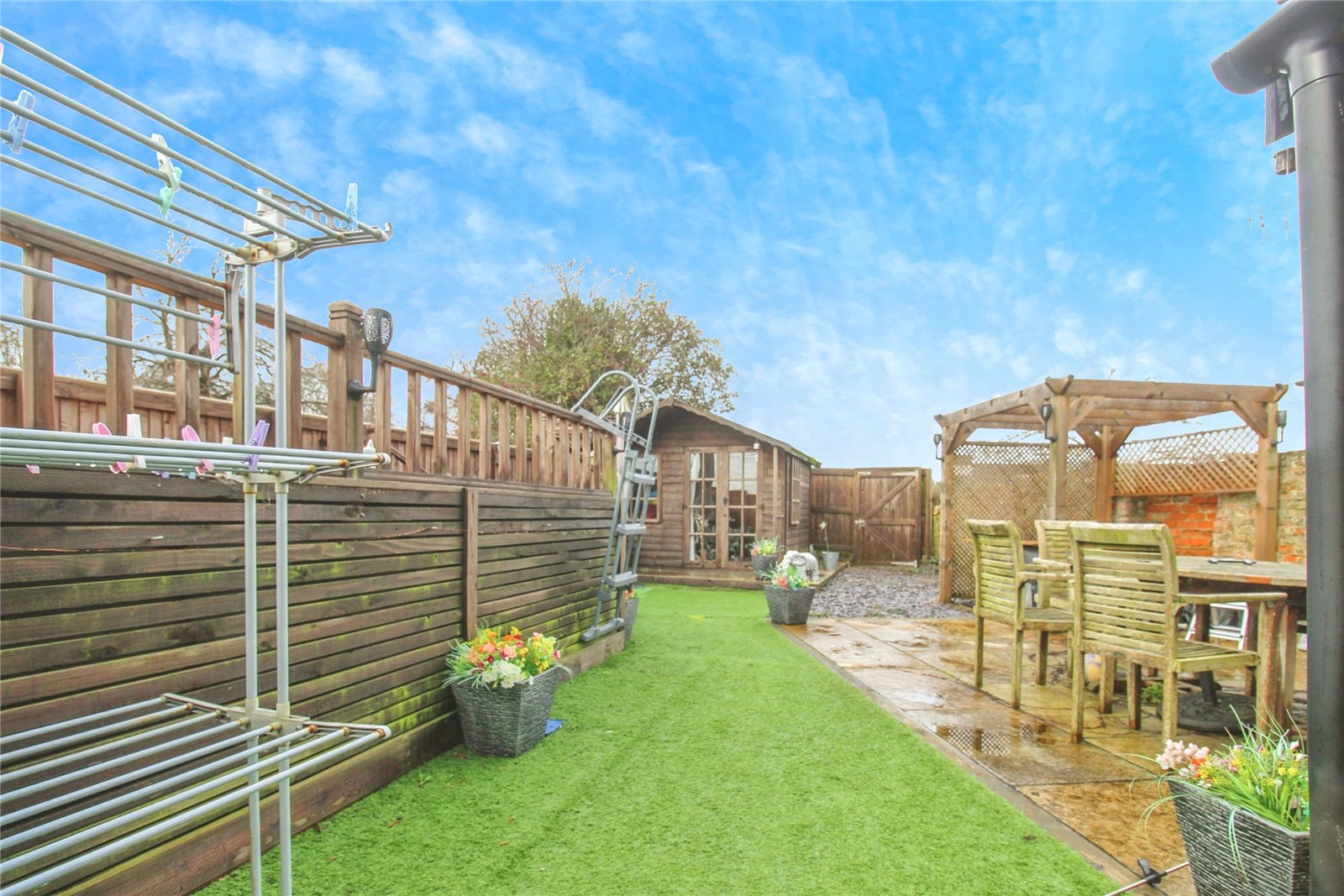 To the front of the property there is an enclosed lawn area with a path to the front door as well as a gate to the parking which is laid to gravel. The private side garden has been set out for sake of ease and is laid to artificial lawn with a patio and useful summerhouse.