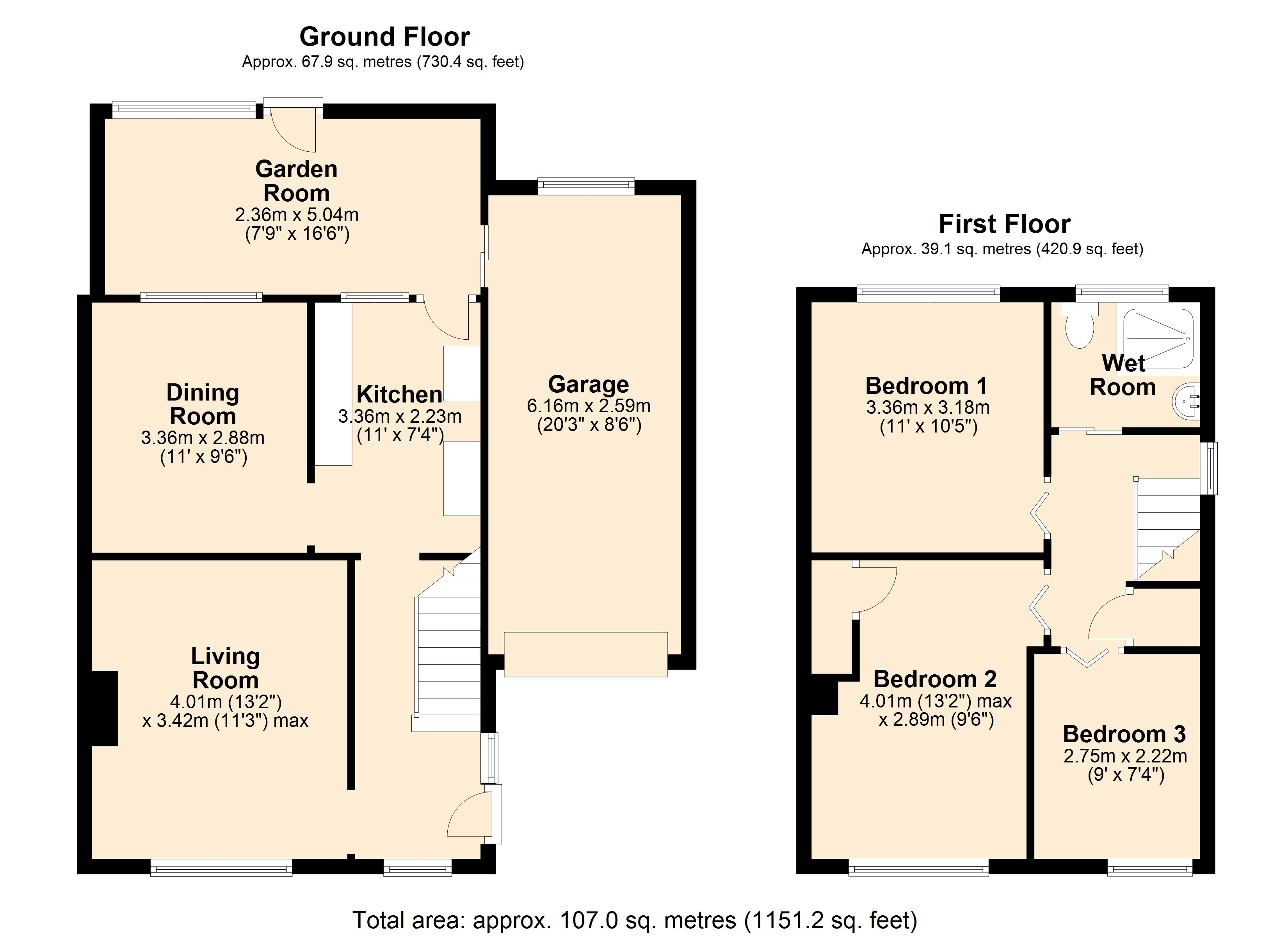 Stepping into the property you find a welcoming hallway with stairs to the first floor and opens to the living room and kitchen. Found to the front, the living room is a pleasant space to relax in front of the telly and has a gas fire with back boiler. The kitchen has a selection of fitted units and leads on to both the dining room and garden room. One may wish to explore removing a wall to create a larger kitchen-diner (subject to building regulations) whilst the garden room is a great extra space with doors to the garden and garage. Moving upstairs, the landing provides access to all three bedrooms along with the wet room. Bedrooms one and two are both doubles whilst the third bedroom is a good single. Completing the internal accommodation is the wet room with shower, WC and wash basin.