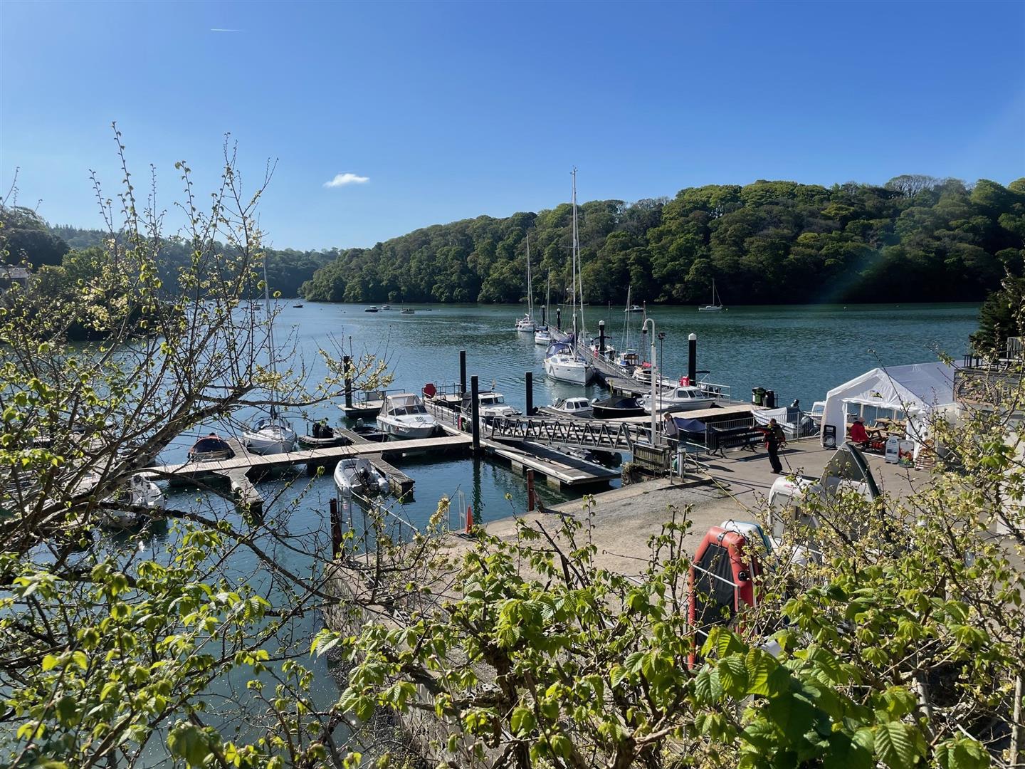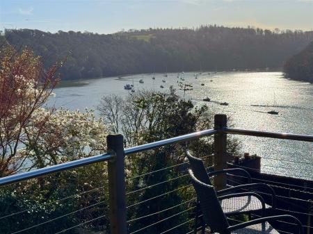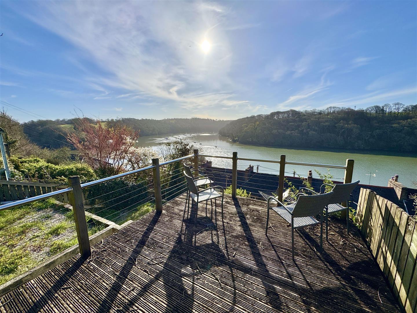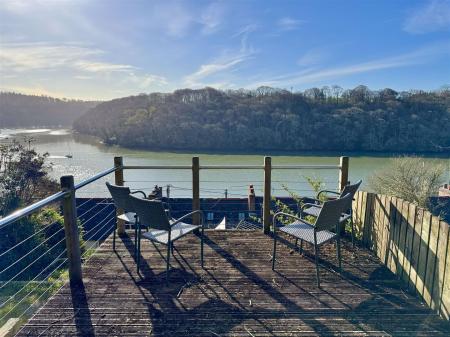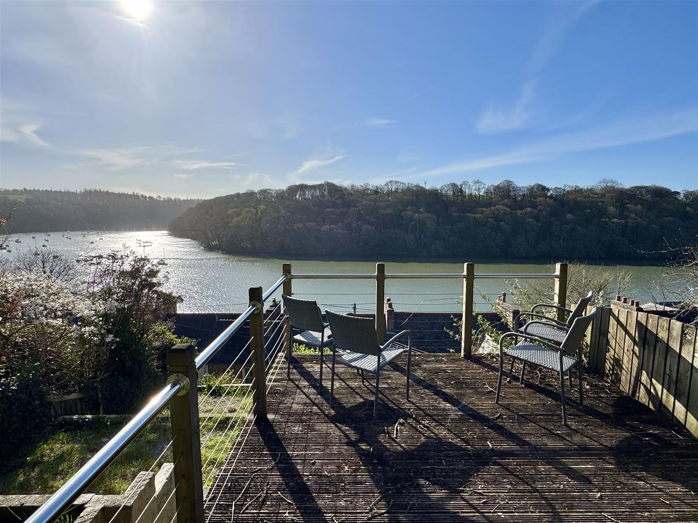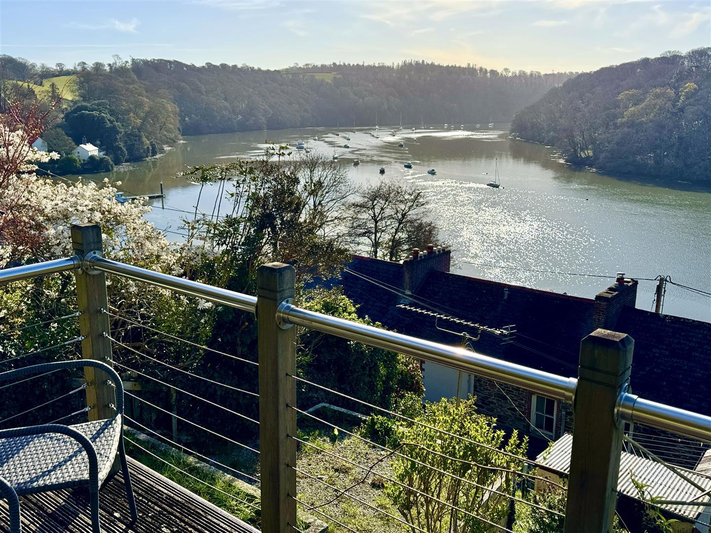 This beautifully presented two double bedroom extended terraced house has gorgeous views of the Truro river from the property and breathtaking views from the top of the garden. The property is ideally located just steps away from the Heron Inn which is the hub of this waterside village community. There is on street parking and to the front of the property and a small area of terrace just big enough for a bench to sit and watch the world go by. The entrance to the property is a stable door and once inside the ground floor space has all been opened up into one large open plan kitchen / living / dining room. This particular property has the advantage of glimpsing the river from the living room with a line of sight between two buildings. The first floor views are even better again because they look over the top of rooftops. The living room has a cosy wood burning stove and practical tiled floors and the kitchen is fitted with a large L shaped range of base and wall units with laminated work surfaces and built-in appliances. Theres’s an integrated Neff multi-function double oven with Neff electric hob and Neff chimney X tractor. There is also a 45 centimetre Neff integrated dishwasher and the washing machine is built in too. At the rear of the property a back door opens to a shared access alleyway (which in one direction gives access past other properties for taking bins out etc. and in the other direction gives access to the rear garden). Heading upstairs, the landing has natural light from a skylight and a cupboard for the hot water cylinder. The main bedroom has an exceptional view of the river and woodlands beyond, and the standout feature of this property is being able to wake up and see the moored yachts on the river below. The second bedroom is a very good size and has a vaulted beamed ceiling with skylights and there are French doors giving access to the rear of the property. The family bathroom is fitted with an electric shower over the bath and glass screen and modern style pedestal basin and WC, and there is also a heated towel rail. Outside at the rear of the property the garden is accessed via shared pathways and there is a block built garden shed and steps up to various levels. At the very top of the garden is a fantastic sun deck with stainless balustrade. From the sun deck you can enjoy a 180° panorama from a superb vantage point, the perfect place for a glass of something chilled!