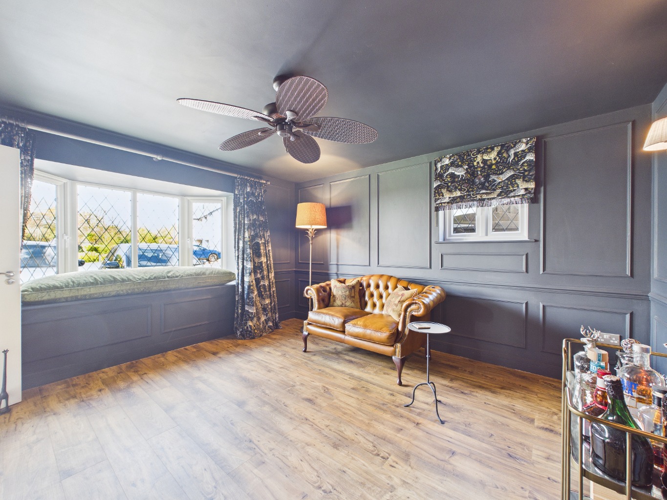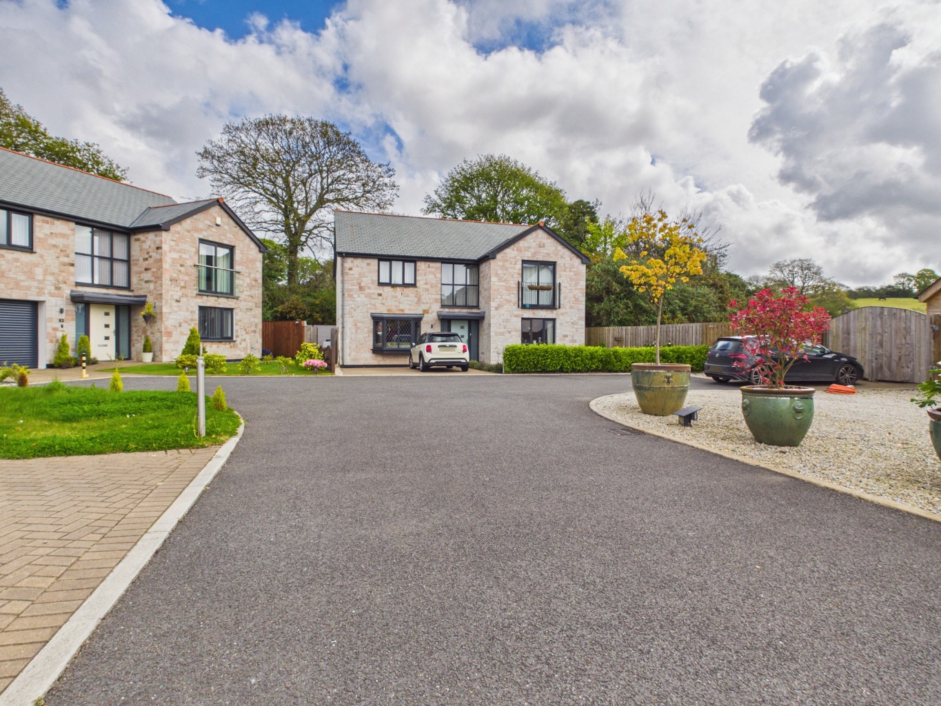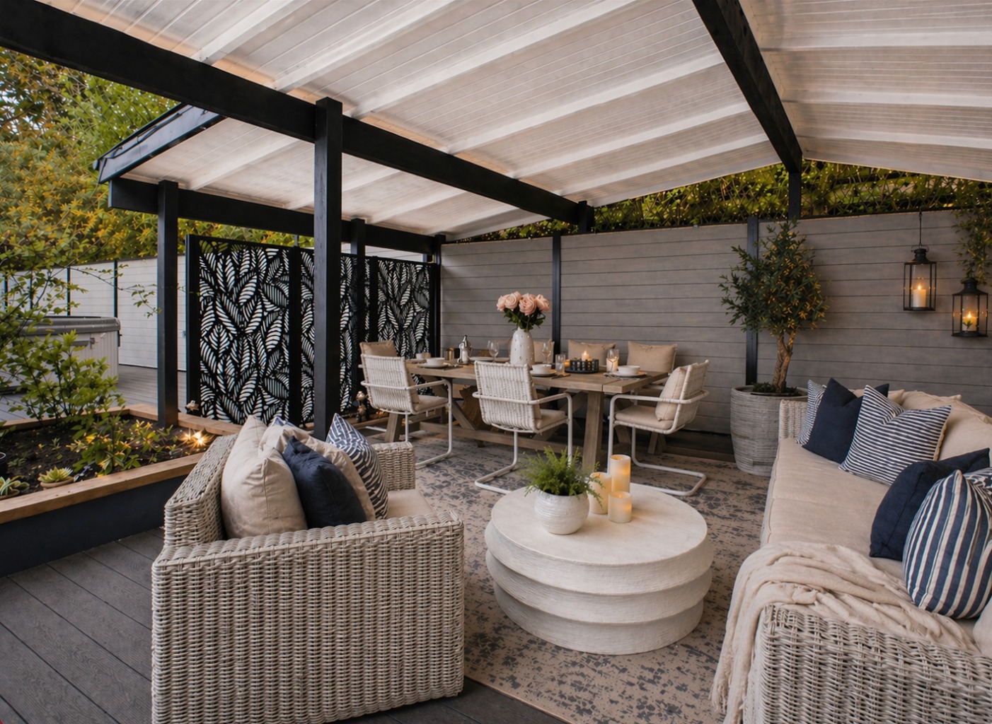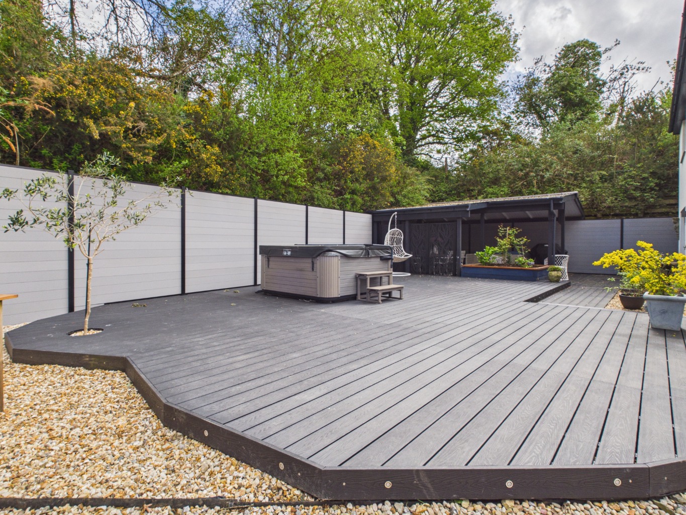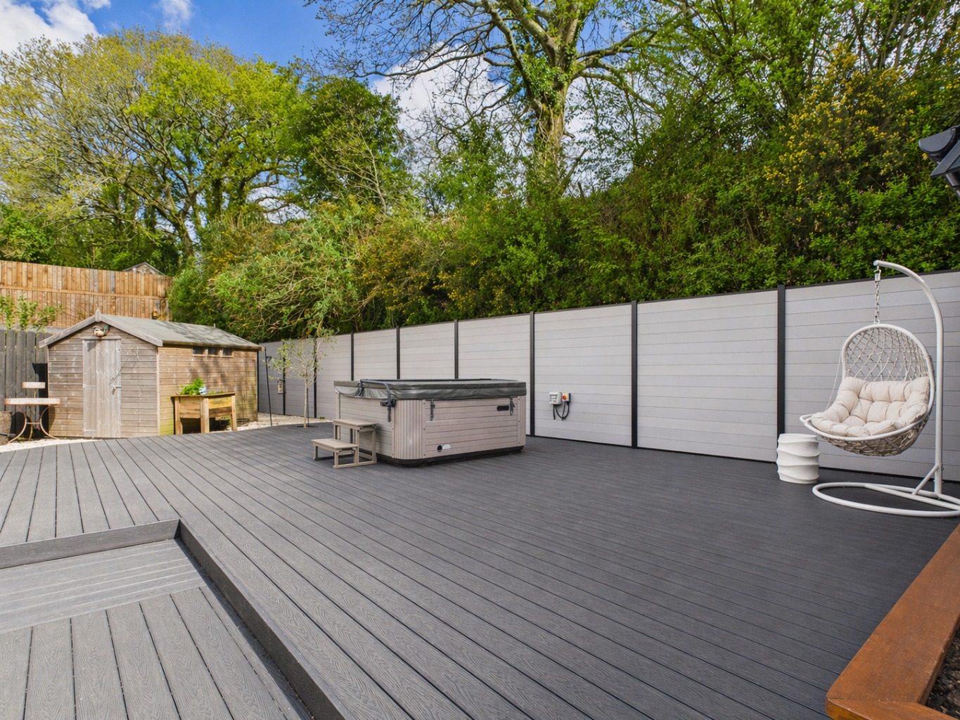 - Private, landscaped rear garden with hot tub, covered dining/barbecue area, and entertainment deck