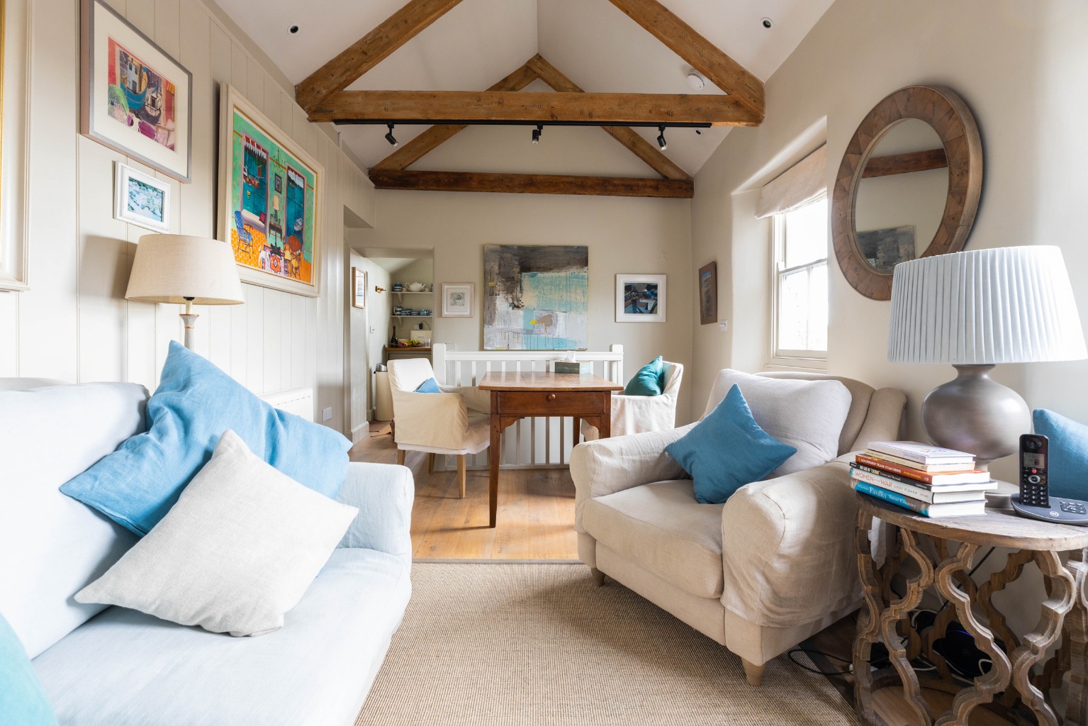 - Living Room with Vaulted Beamed Ceiling, Stripped Oak Floor, Creamed Panelled Walls, and Log Burner.