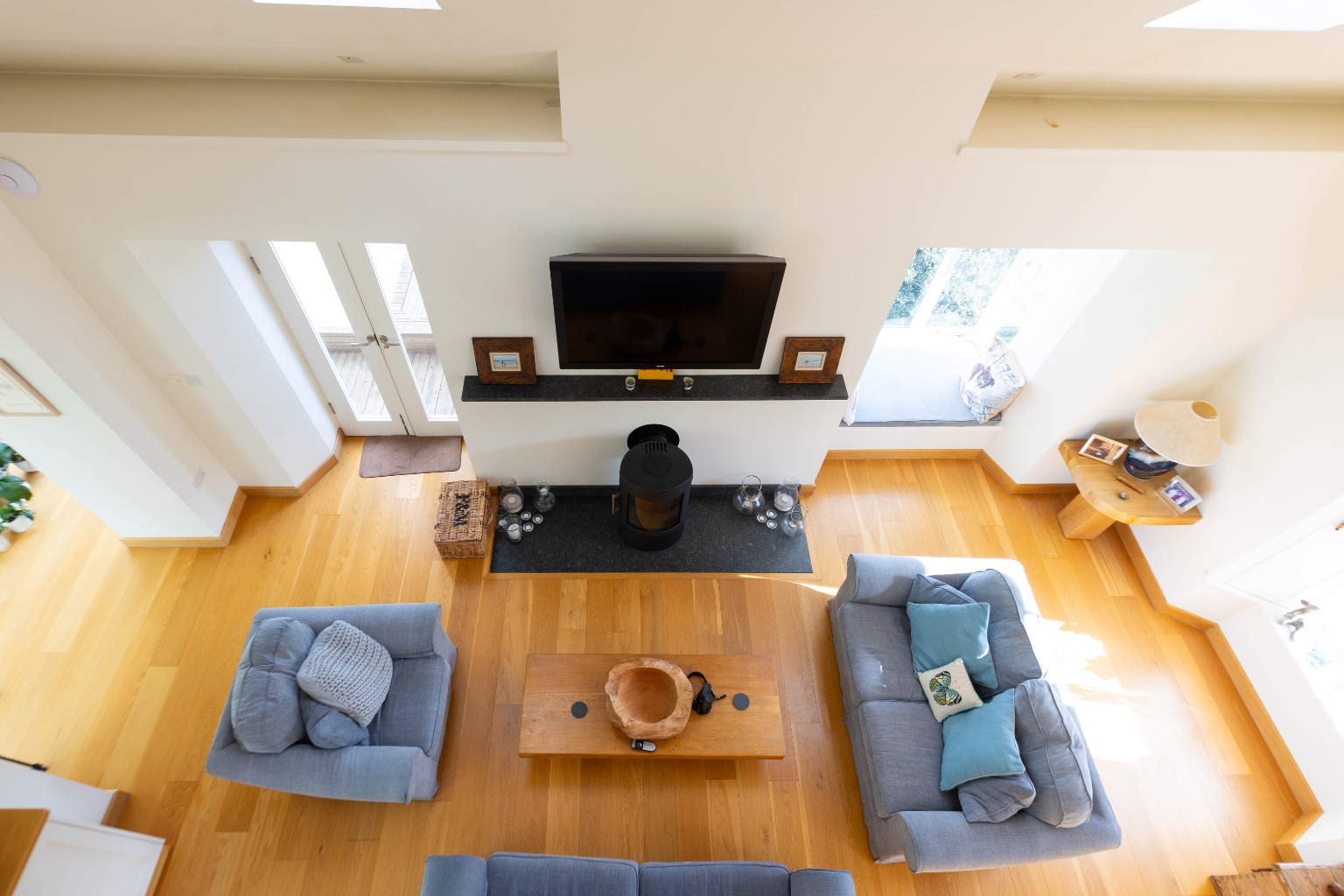 - Spacious open-plan living area with a mezzanine office (potential fourth bedroom).