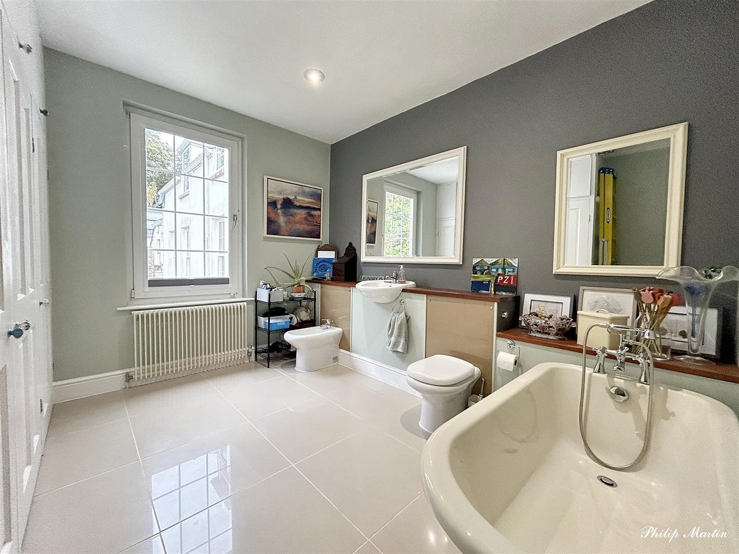 Bathroom - 3.39 x 2.93 (11'1" x 9'7") - A modern bathroom with white claw-foot and rolled edge bath, hardwood top sanitary unit with concealed WC, in-set white basin and bidet. Porcelain tiled floor, extractor fan, window to rear and radiator. Three doors opening to fitted airing cupboard and boiler cupboard with oil-fired Worcester boiler.
