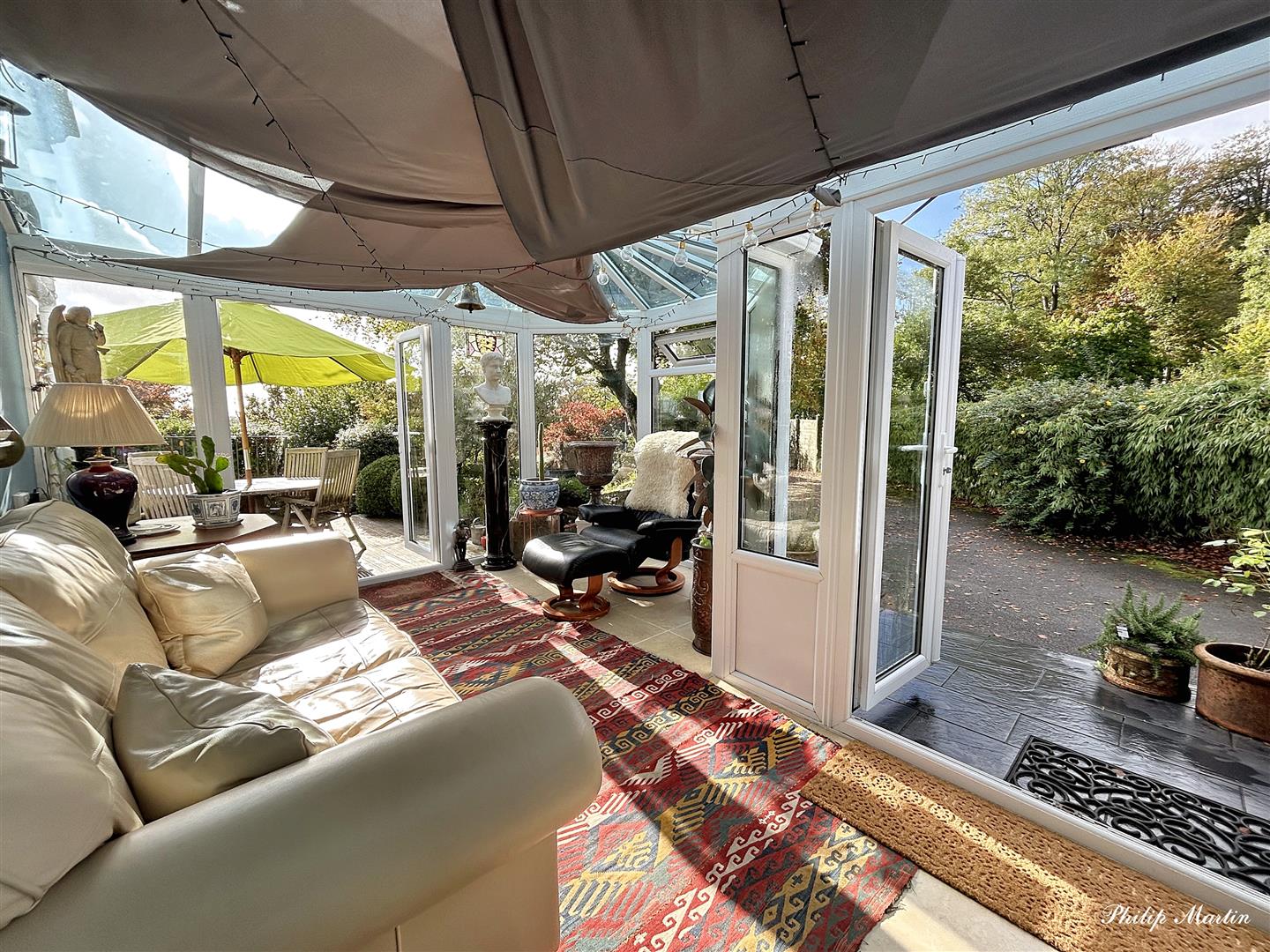 Conservatory - 3.45 x 4.84 (11'3" x 15'10") - Steps lead up to double doors and a secondary set of double doors open to an elevated decked seating area enjoying views.