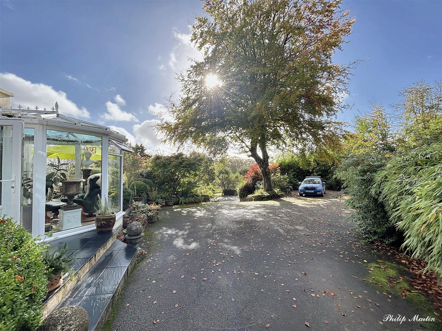 West Wing is accessed via a long, private, and picturesque shared driveway, which leads to a private drive that takes you to a generous parking and turning area beside the house. From the tarmac parking area, there is direct access to the front door through the conservatory. Adjacent to this is an elevated timber deck, offering views of the surrounding countryside.