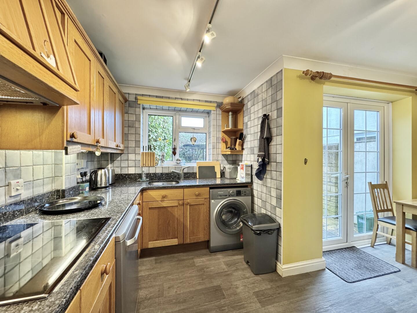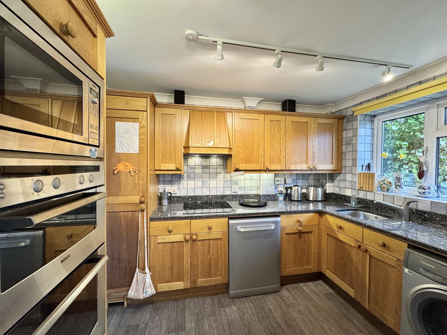 This impressive and flexible four bedroom detached family house benefits from a ground floor extension, a large double garage and a surprisingly extensive enclosed and relatively private garden. The property is set back from the road and looks out over green space. To the front there is driveway parking and the double garage has an electric door. The front entrance has a useful storm porch and stepping inside we enter the hallway with the flexible extension room to the left and the living room to the right. The extension has been used as a bedroom but would work equally well as a playroom, study, music room or dining room. The living room has a square bay window and there are glazed doors opening to the kitchen / dining room. The kitchen has a range of oak style shaker base, wall and tower units and the work surfaces are polished granite with granite upstands, undermounted sink and drainer grooves. There is a built in Bosch double oven, a microwave, hob and extractor. There's also space and plumbing for a dishwasher and washing machine. There is space for a family dining table and French doors to the garden. The ground floor also has a useful cloakroom / WC next to the back door. Heading upstairs, the landing is light and bright with an attractive arched window. There are two large double bedrooms with built-in wardrobes and a further single bedroom making four in total. The family bathroom has a white suite with shower bath, glass screen and electric shower over. The oil fired central heating boiler is located outside and there is UPVC double glazing. Outside at the side and rear the garden is large and relatively level with a good degree of privacy from high hedges. There is a large lawn, patio with summer house, garden shed and deck with timber pergola.