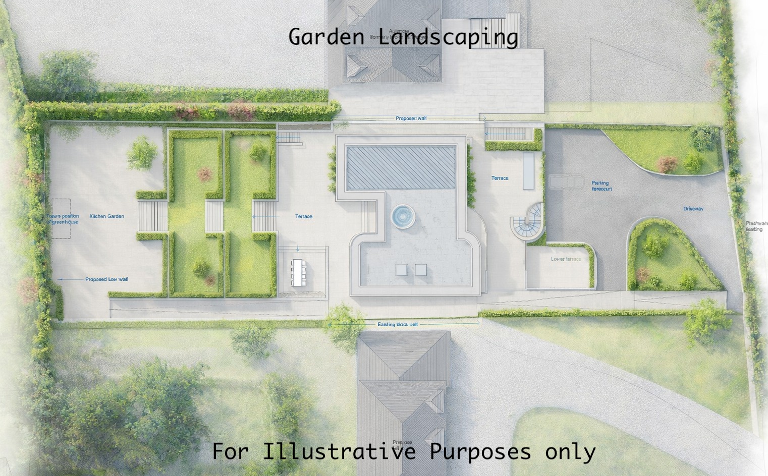 - Landscaping scheme incorporating terraces, courtyard and kitchen garden
