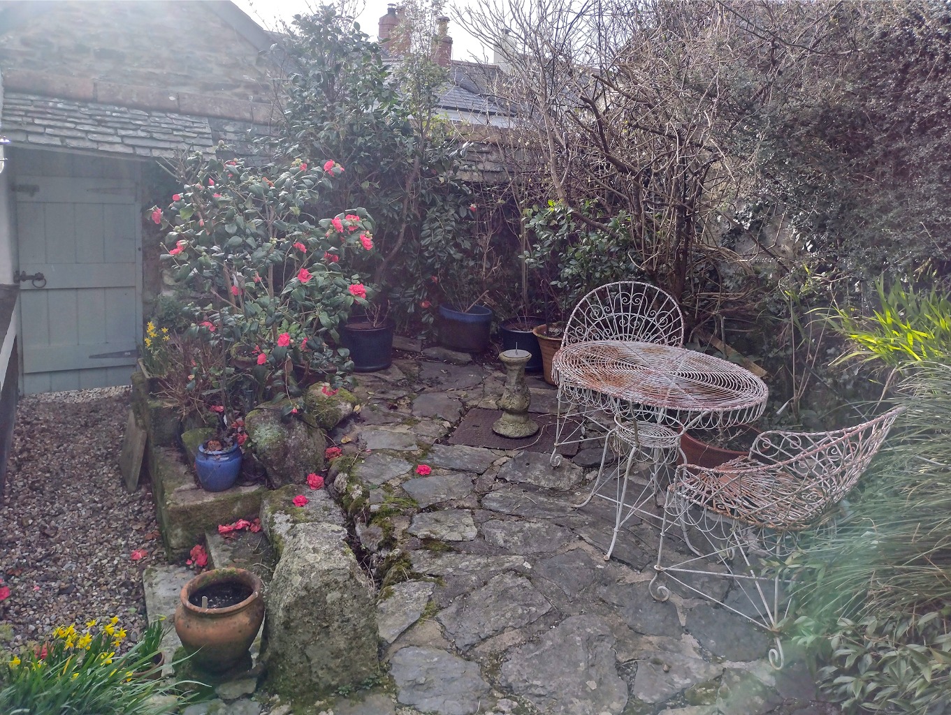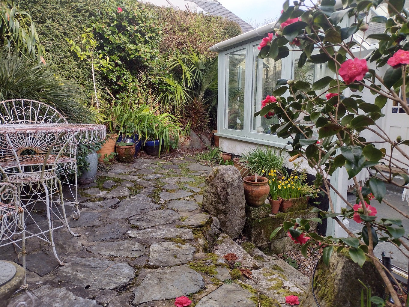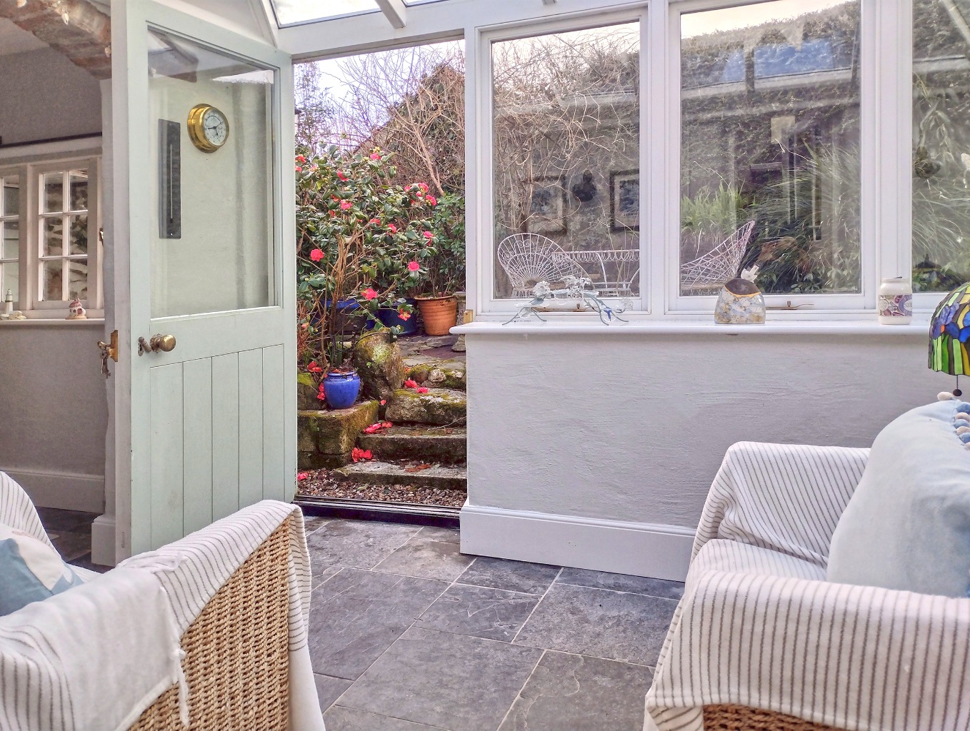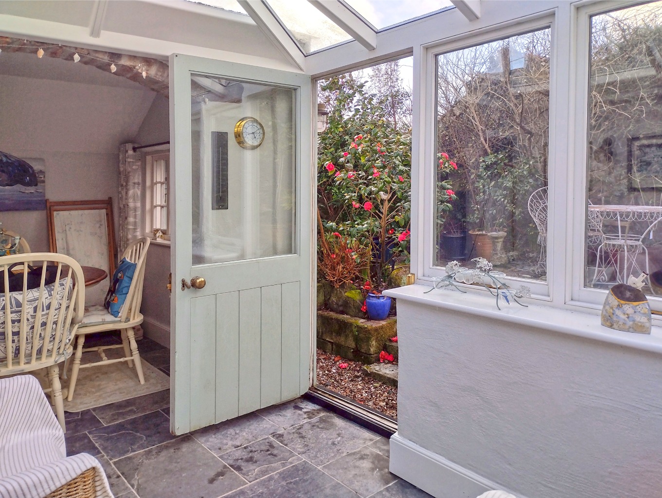 - Sunroom opening directly onto a fully enclosed courtyard garden.