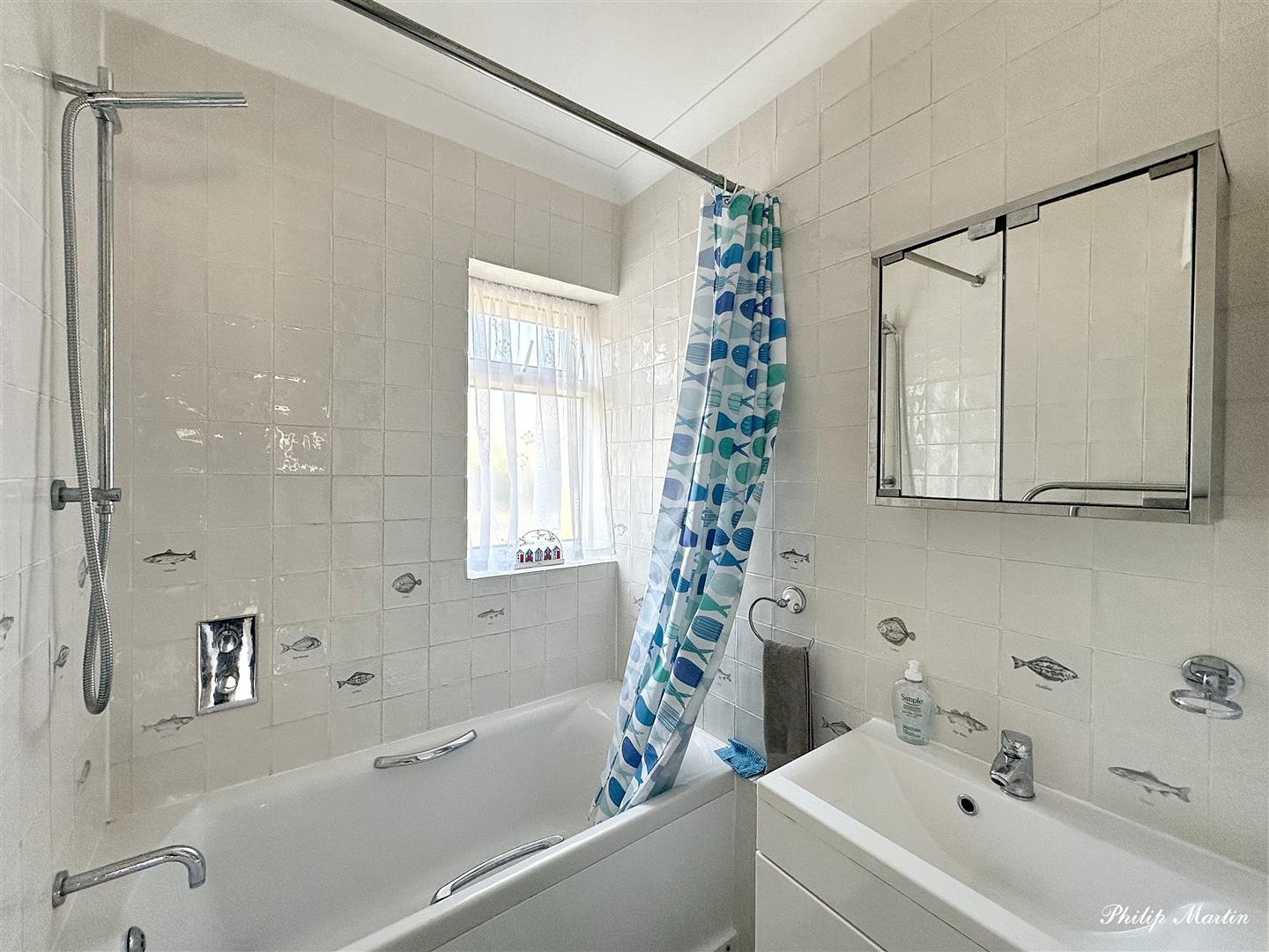 Bathroom - 2.37m x 1.43m (7'9" x 4'8") - Fully tiled bathroom suite comprising bath with shower over and vanity hand wash basin. Obscured window to rear and towel rail. Door into airing cupboard.