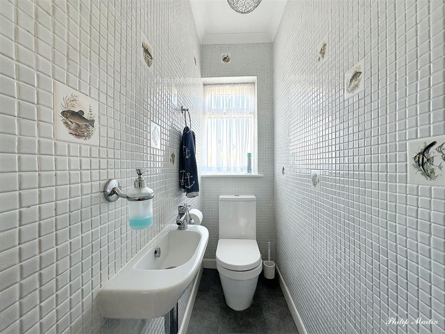 W.C. - Fully tiled with wall mounted hand wash basin and low level w.c. Obscured window to rear.
