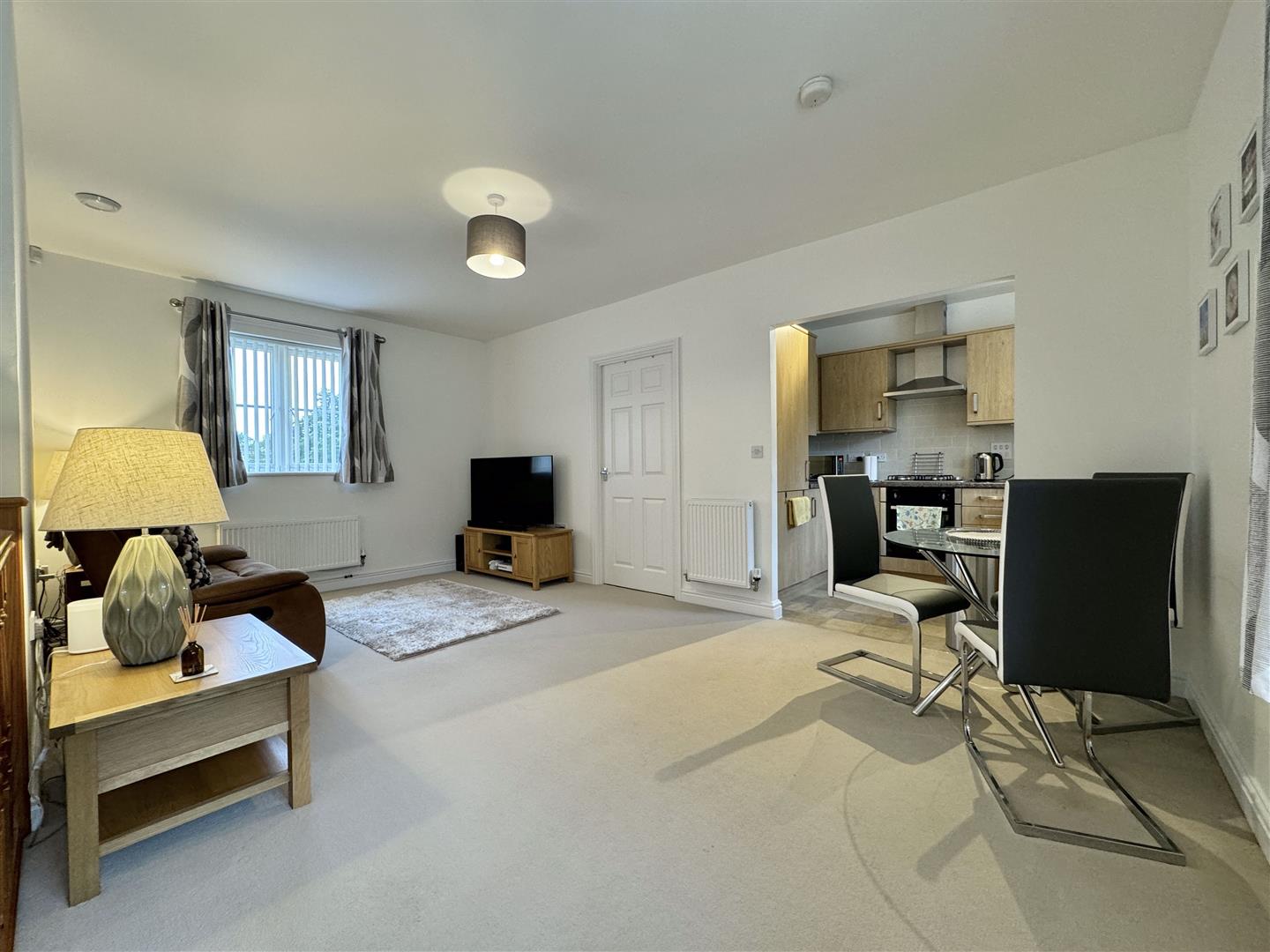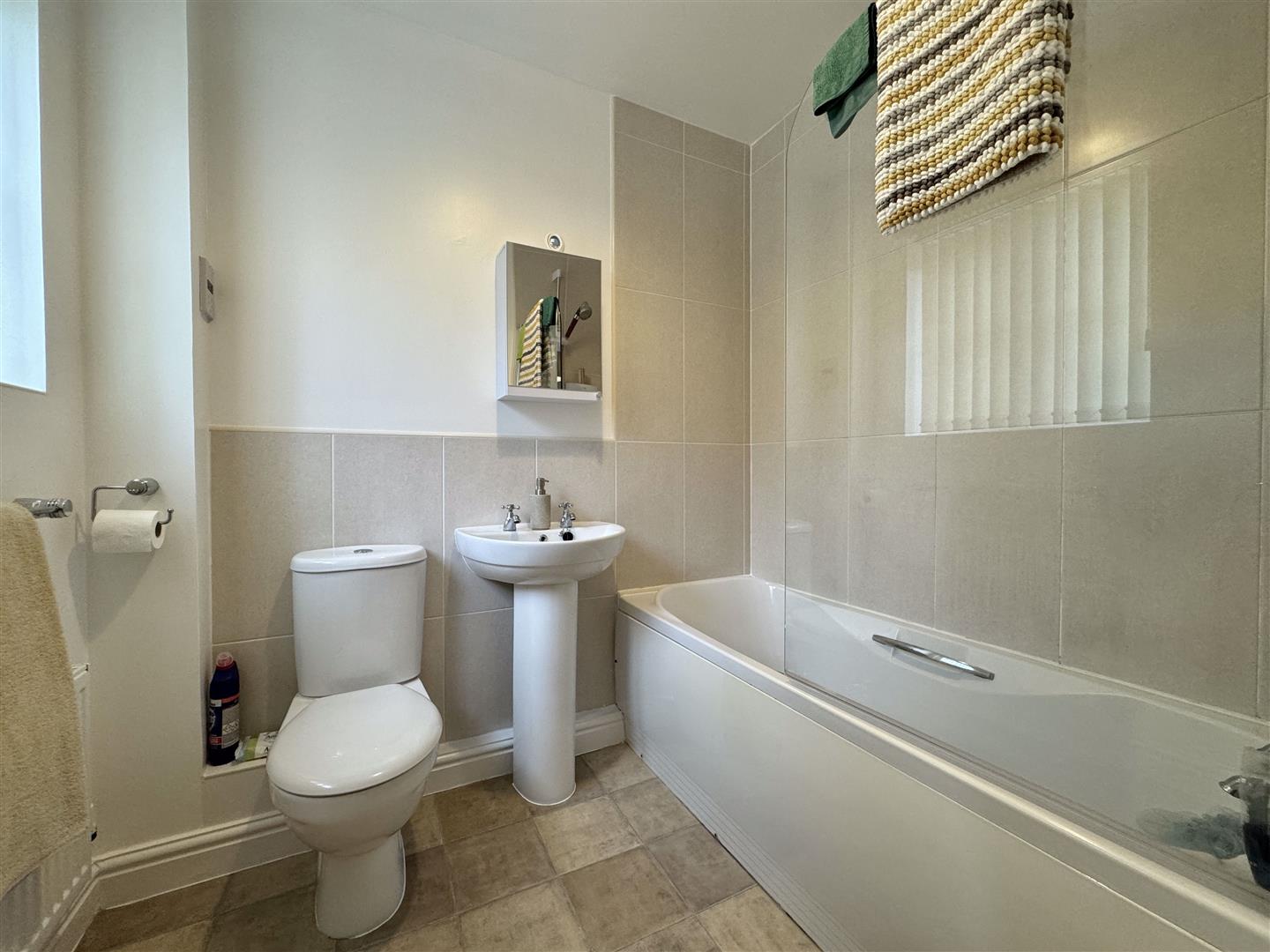 Off the living area is the main double bedroom, with space for a wardrobe as well as a built-in airing cupboard space. Next door is the bathroom with white suite and modern design including a close coupled WC, pedestal basin and bath with electric shower over and glass screen. On the other side of the living space is a door to the second single bedroom (currently used as a home office). The front windows of the property look out onto Tinney Green which is a pleasant open space, and the living space is dual aspect providing plenty of light from both sides of the property.