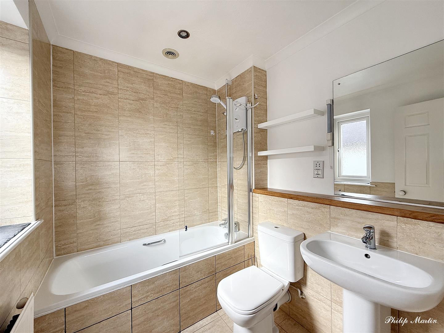 Bathroom - 2.09m x 1.64m (6'10" x 5'4") - Fully tiled bathroom compirisng bath with shower over, hand wash basin and low level w.c. Obscured window to side, extractor fan and heated towel rail.