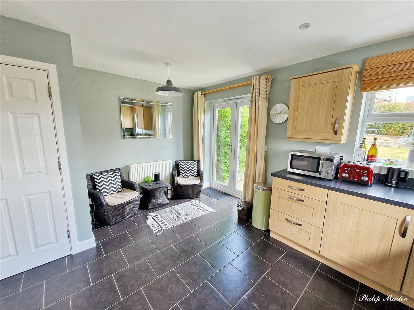 Kitchen/Dining Room - 4.49m x 3.88m (14'8" x 12'8") - Dual aspect room with window to side and rear, including double doors opening out into rear garden. Fitted with a good range of base and eye level units with worktop over. Inset sink and drainer with integrated oven and four ring gas hob with extractor over. Space for fridge/freezer and plumbing for dishwasher. Space for dining table. Radiator.