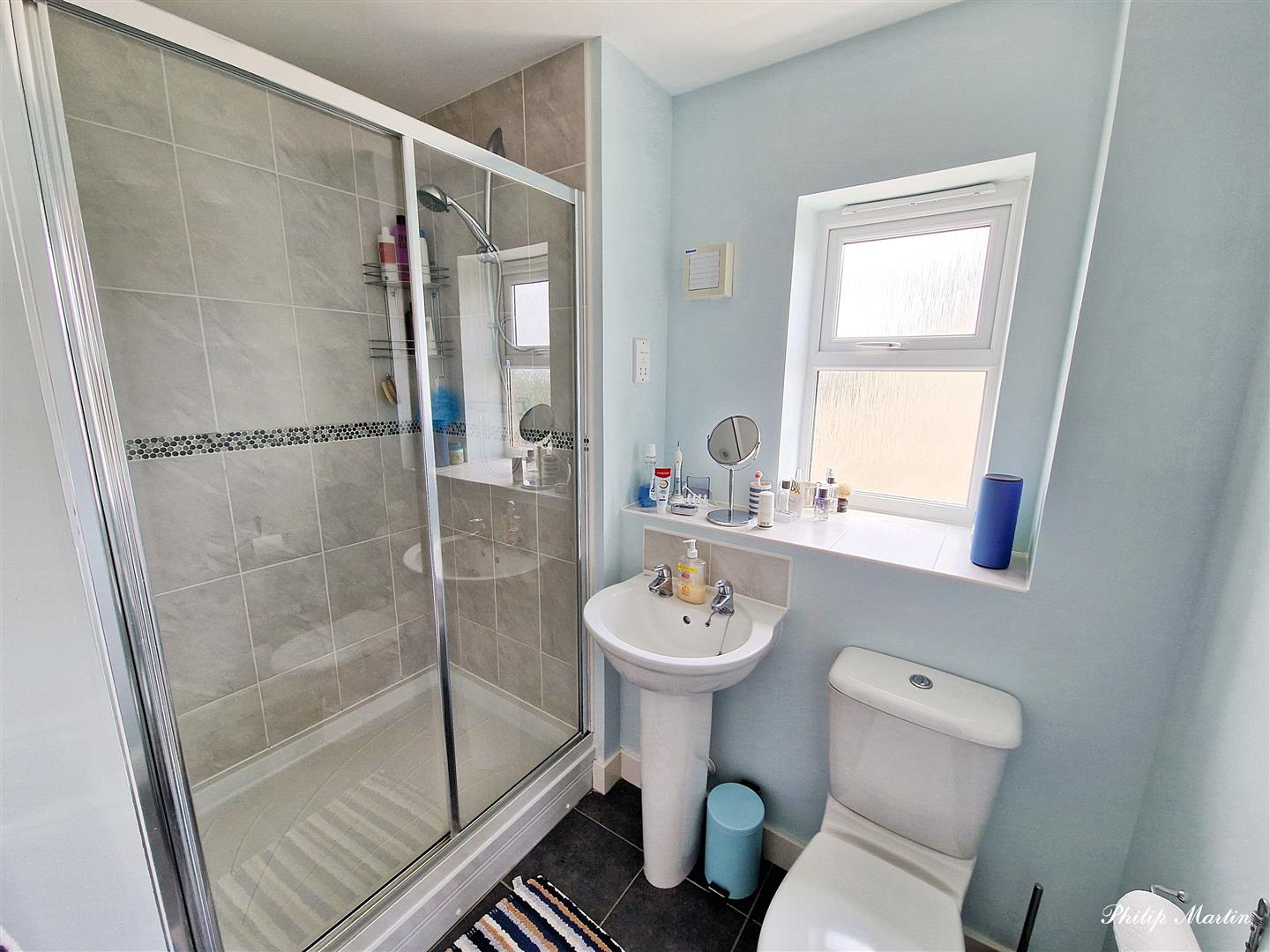 En-Suite - 2.45m x 2.17m (8'0" x 7'1") - Double shower, wash hand basin, and low level WC. Heated towel rail and extractor fan.