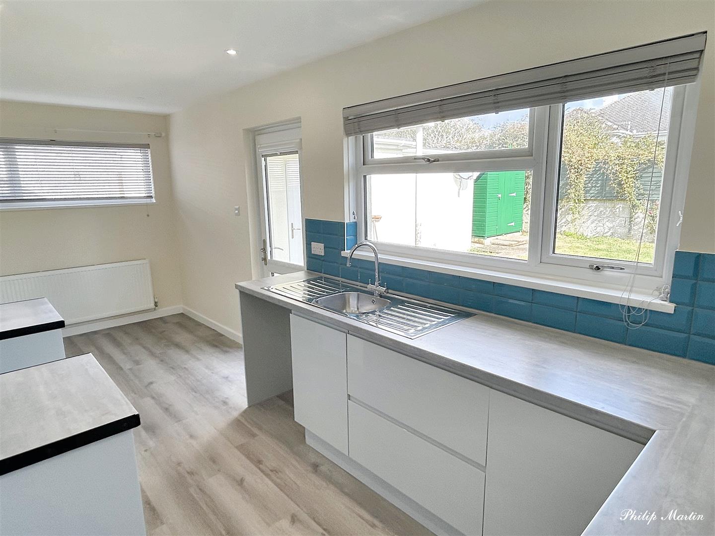 Kitchen/Dining Room - 5.75m x 2.17m (18'10" x 7'1" ) - Brand new kitchen with glossy modern grey units, worktops incorporating single stainless steel sink with double drainer, space and plumbing for washing machine below. Space for electric cooker with extractor hood over. Space for fridge freezer. Twin aspect with windows to side driveway and overlooking the rear garden. Half glazed door leading to rear garden. Radiator, spotlights, smoke alarm.