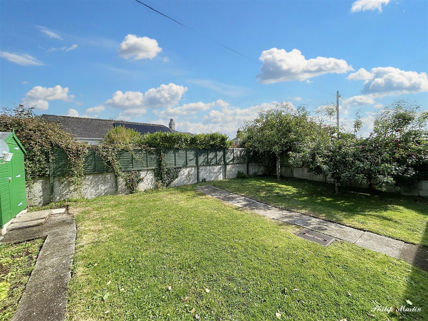Rear Garden - The rear garden is enclosed within a solid block wall with wooden fence over. It is extremely private and not overlooked whatsoever. The garden enjoys sun all day and is mainly gently sloping lawn divided by a central pathway. Mature apple tree. Wooden garden shed with pitched roof. Undercover paved area leading from the kitchen/dining room with doors leading to the garage, storage shed and to the entrance drive. Security light.