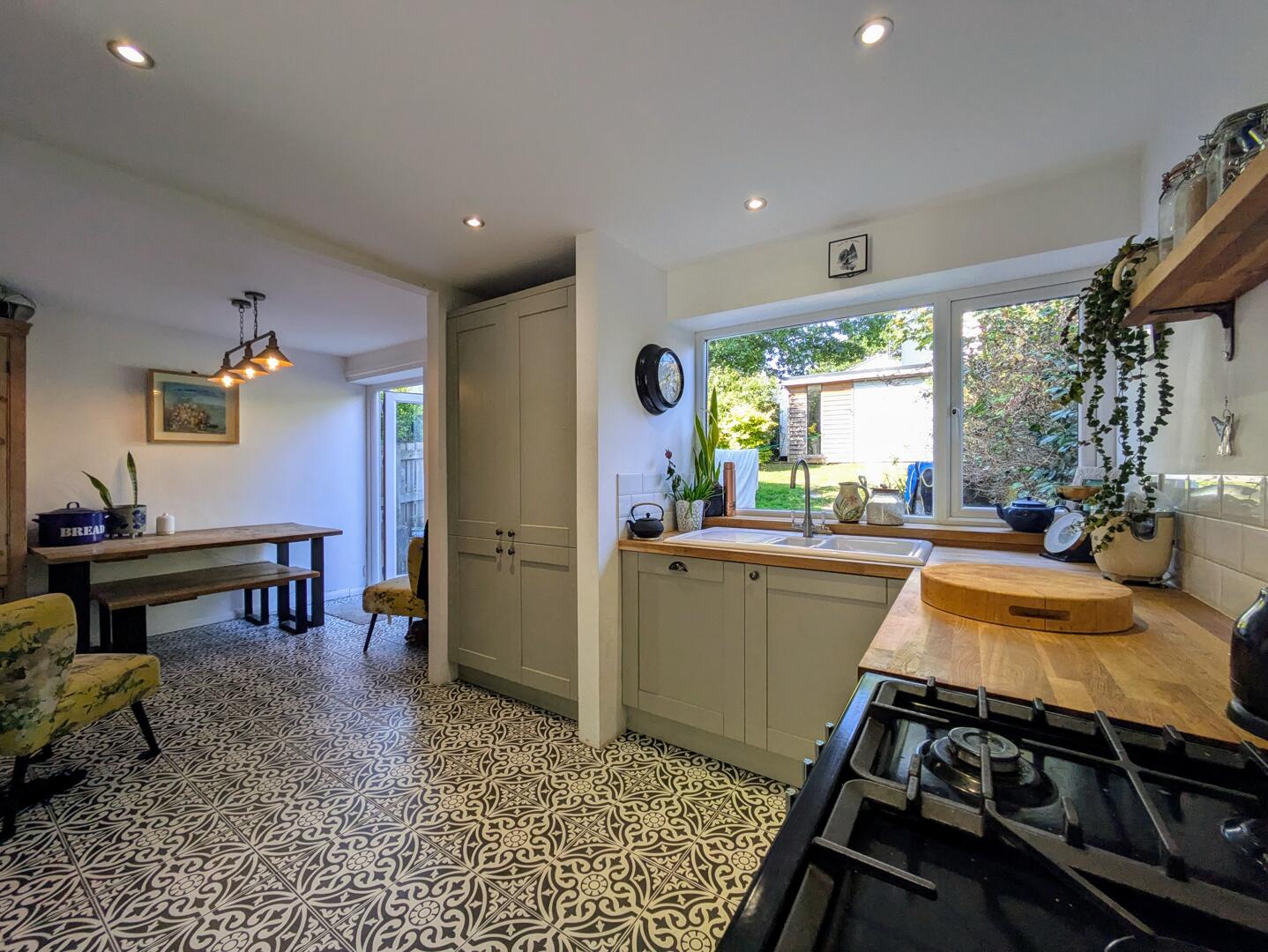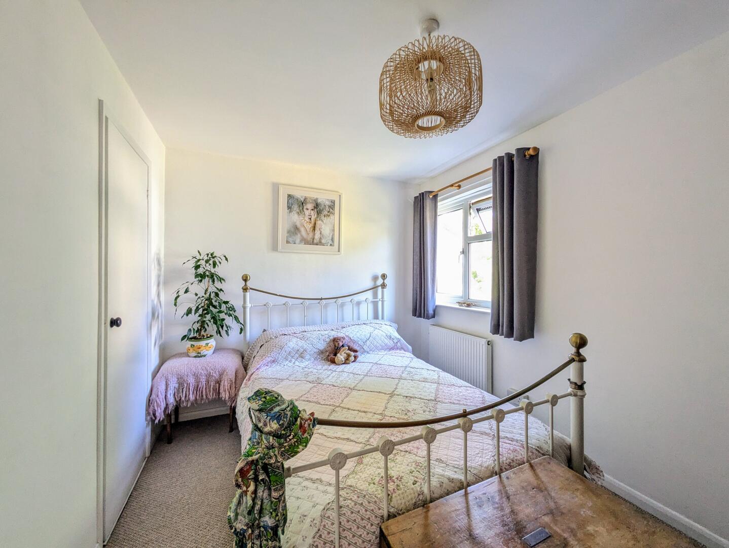 The rear garden is accessed from the dining room and enjoys a sunny aspect with a good degree of privacy. There is an area of hard-standing adjacent to the house, with steps rising to a level patio area. Beyond this is an area of lawn, pretty shrubs and a pathway leading to a separate chalet-style outbuilding which is of a generous size and could provide a variety of uses.