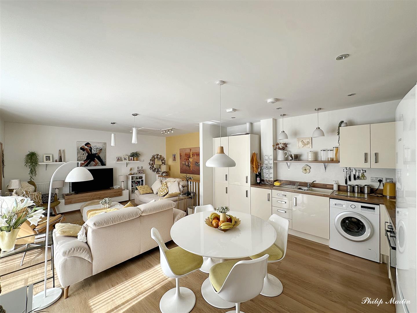 Open Plan Kitchen/Dining/ Sitting Room - 7.75m x 5.04m (25'5" x 16'6") - A spacious open plan kitchen/dining/living room with large windows to front aspect allowing for plenty of natural light. Comprising kitchen with range of base and eye level units with worktops over and upstands. Inset sink and drainer with space and plumbing for washing machine. Integrated appliances electric oven and four ring gas hob with extractor fan over. Space for fridge/freezer. Ample space for dining table and designated sitting room area. Door onto;