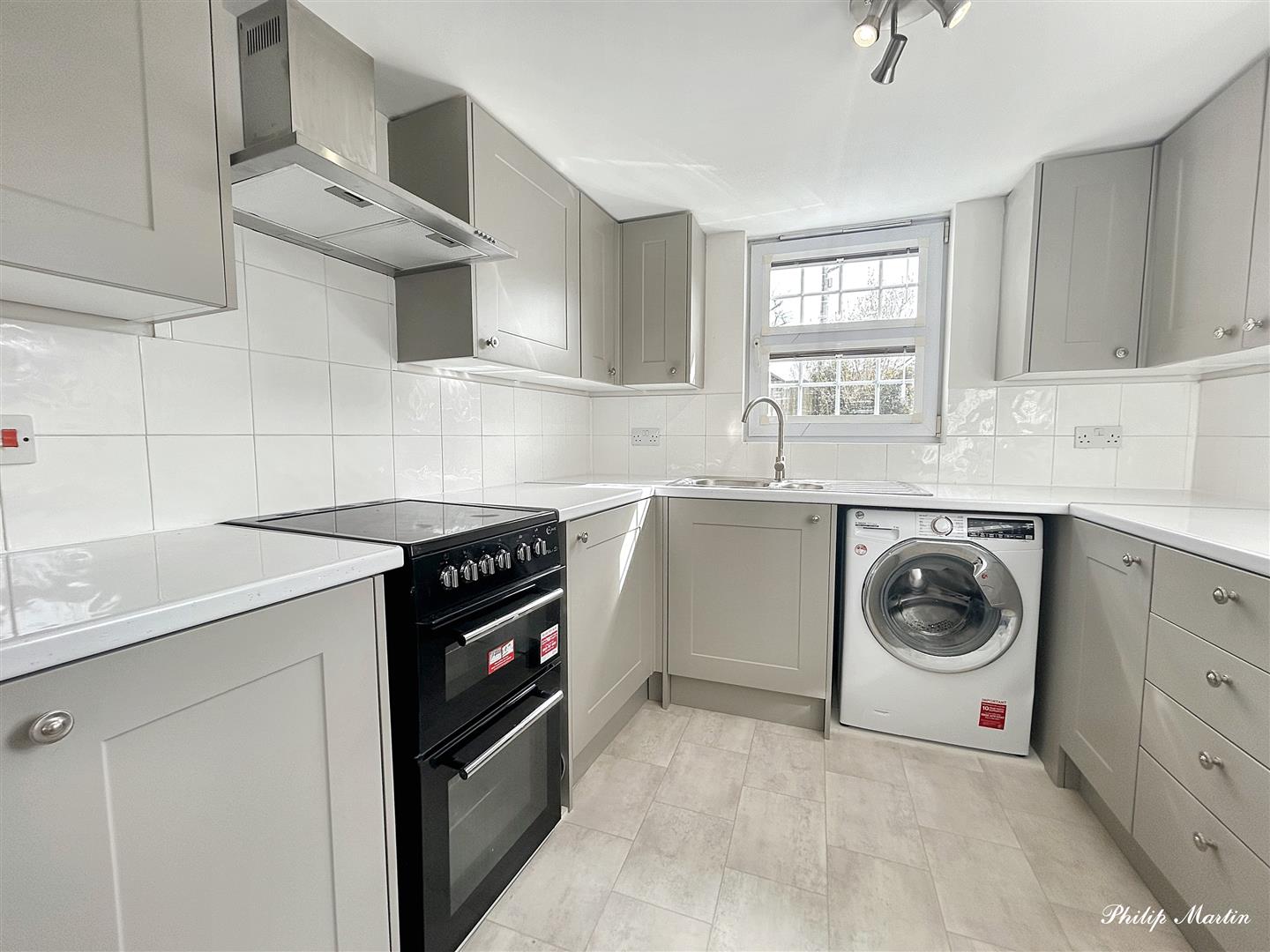 Kitchen - 3.78 x 2.91 (12'4" x 9'6") - Fitted with a range of base and eye level units with worktop over, sink and drainer inset. Windows to two sides. There is a functioning cooker and washing machine and a space for a fridge.