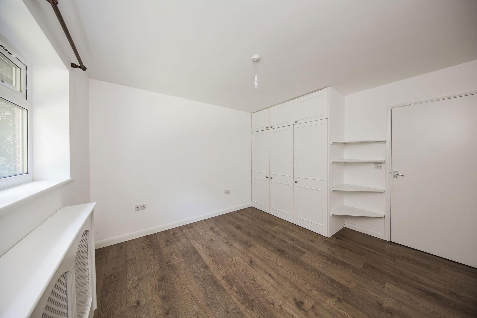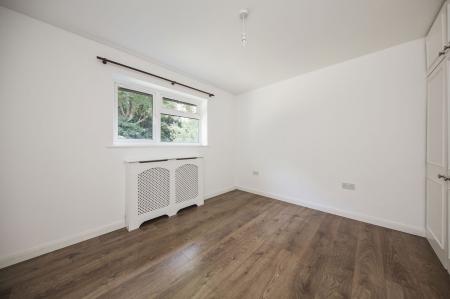 BEDROOM: Triple fitted wardrobe and cupboards above, wood effect laminate flooring, radiator with cover and window to rear overlooking the garden.