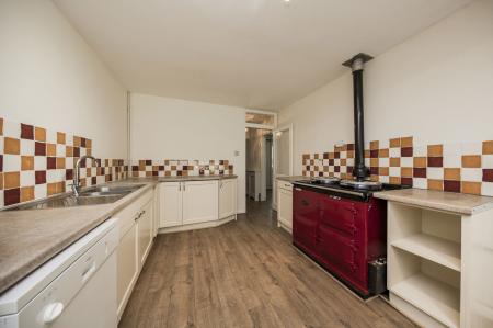 KITCHEN/BREAKFAST ROOM: Traditional style range of low level units with granite effect rolltop worksurfaces incorporating a one and half bowl stainless steel sink. Aga cooker, space for dishwasher and plenty of space for breakfast table and chairs. Wood effect laminate flooring, radiator with cover and French doors opening out to the rear patio and garden beyond.