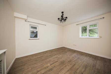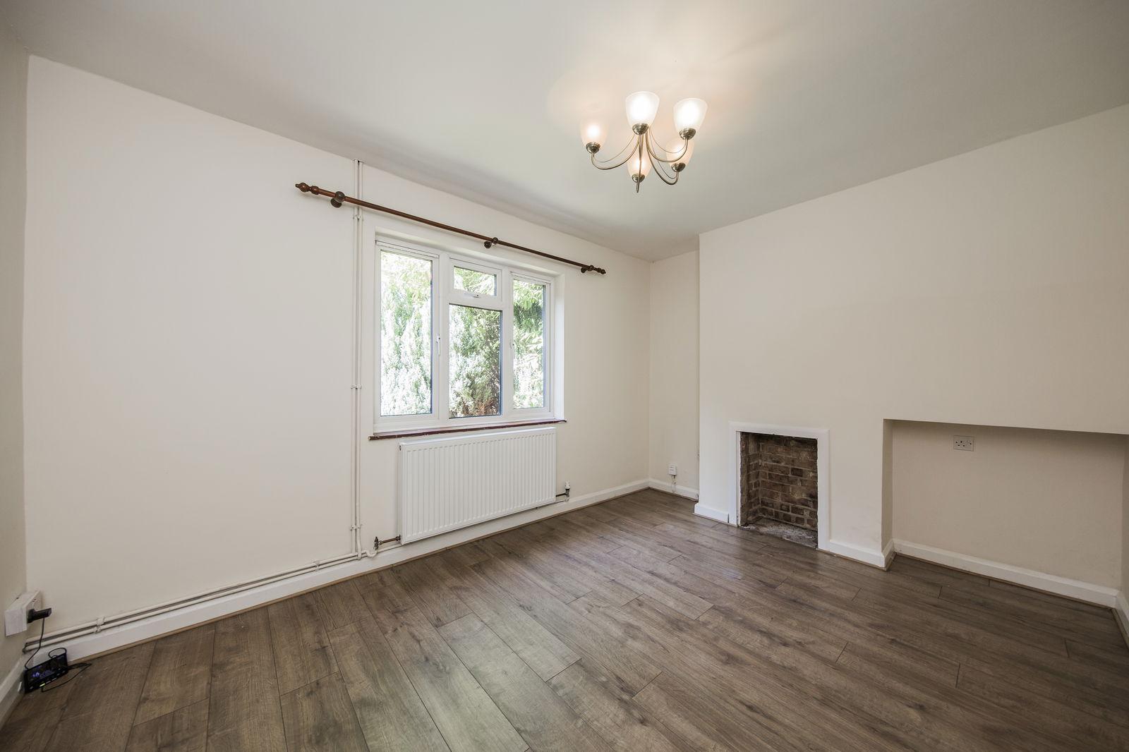 Brick fireplace, radiator, wood effect laminate flooring, window to front and square opening into: