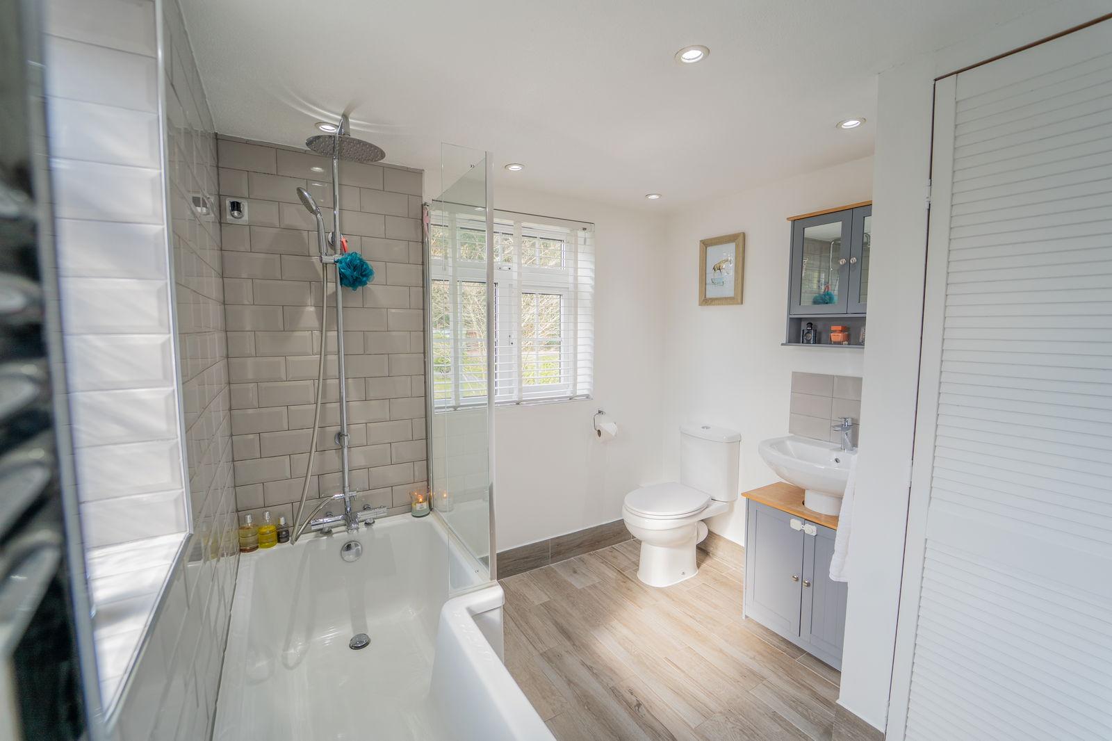 FAMILY BATHROOM: Fitted with a suite comprising a 'P' shaped bath with mixer tap and drench head above with further shower attachment, low level WC, pedestal wash hand basin with tiled splashback and cupboard below. Tiled wood effect flooring, heated towel rail, downlights. Double glazed windows to side and front.