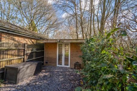 OUTSIDE REAR: To the rear there is a generous garden which has a paved patio area and steps leading down to the lawn. Fencing and hedging to borders. There is an outbuilding which has light and power and is suitable for use as a home office or hobby room/gym.