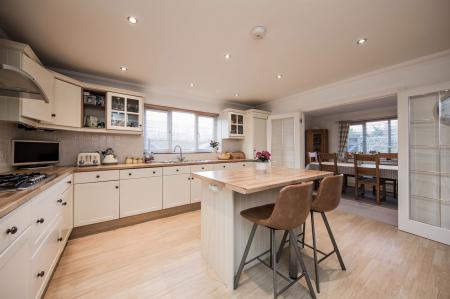 A range of wall and base units with a complementary work surface. Good general storage space. Two inset 'Neff' electric ovens and five ring 'Neff' gas hob with tiled splashback and extractor hood over. Integrated dishwasher. Inset one and a half bowl stainless steel sink with mixer tap over. Two integrated lower level freezers and further integrated fridge. Feature island with storage space and seating for two people. Wood effect flooring, radiator. Partially glazed, double glazed door to the side of the property with inset opaque panel. Double glazed windows to the front with fitted blind. Georgian style partially glazed French doors to: