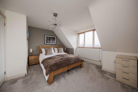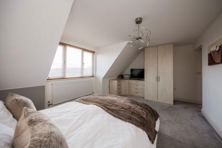 Carpet, radiator, areas of sloping ceiling. Space for bed and associated bedroom furniture and a bank of fitted wardrobes with shelving and areas of fitted coat rails. Dual aspect double glazed windows with views across both private gardens and neighbouring farms each with fitted blinds.