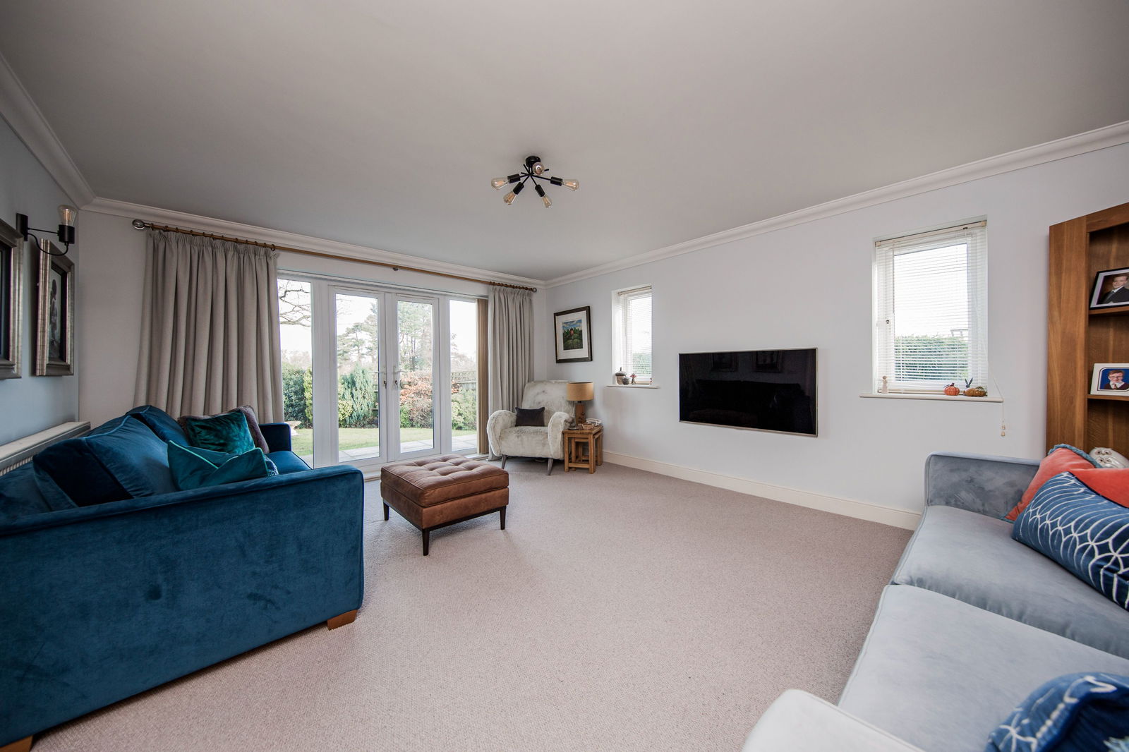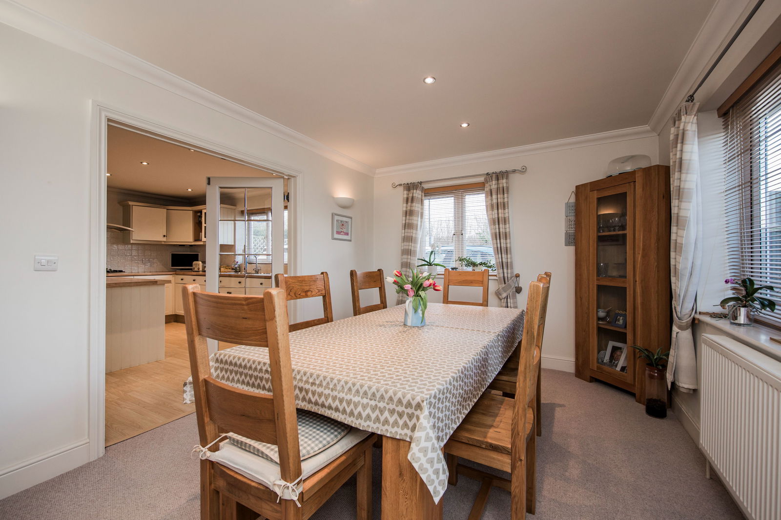 Fitted carpet, ample space for a large dining table chairs and associated furniture. Dual aspect windows with double glazed windows to the front and the kitchen and a further bank of double glazed windows to the side affording views over the private gardens.