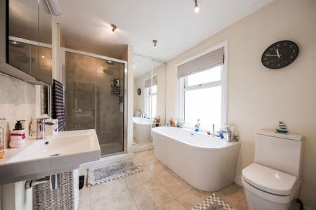 An excellent sized bathroom, opaque double glazed window to the side with fitted Roman blind, wall mounted feature sink with mixer tap, shower cubicle with sliding glass doors and singe head shower, feature bath with mixer tap, low level WC, mirror fronted medicine cabinet with electric lighting, heated towel rail. Airing cupboard with fitted shelving and wall mounted boiler behind mirrored doors, tiled flooring, radiator.